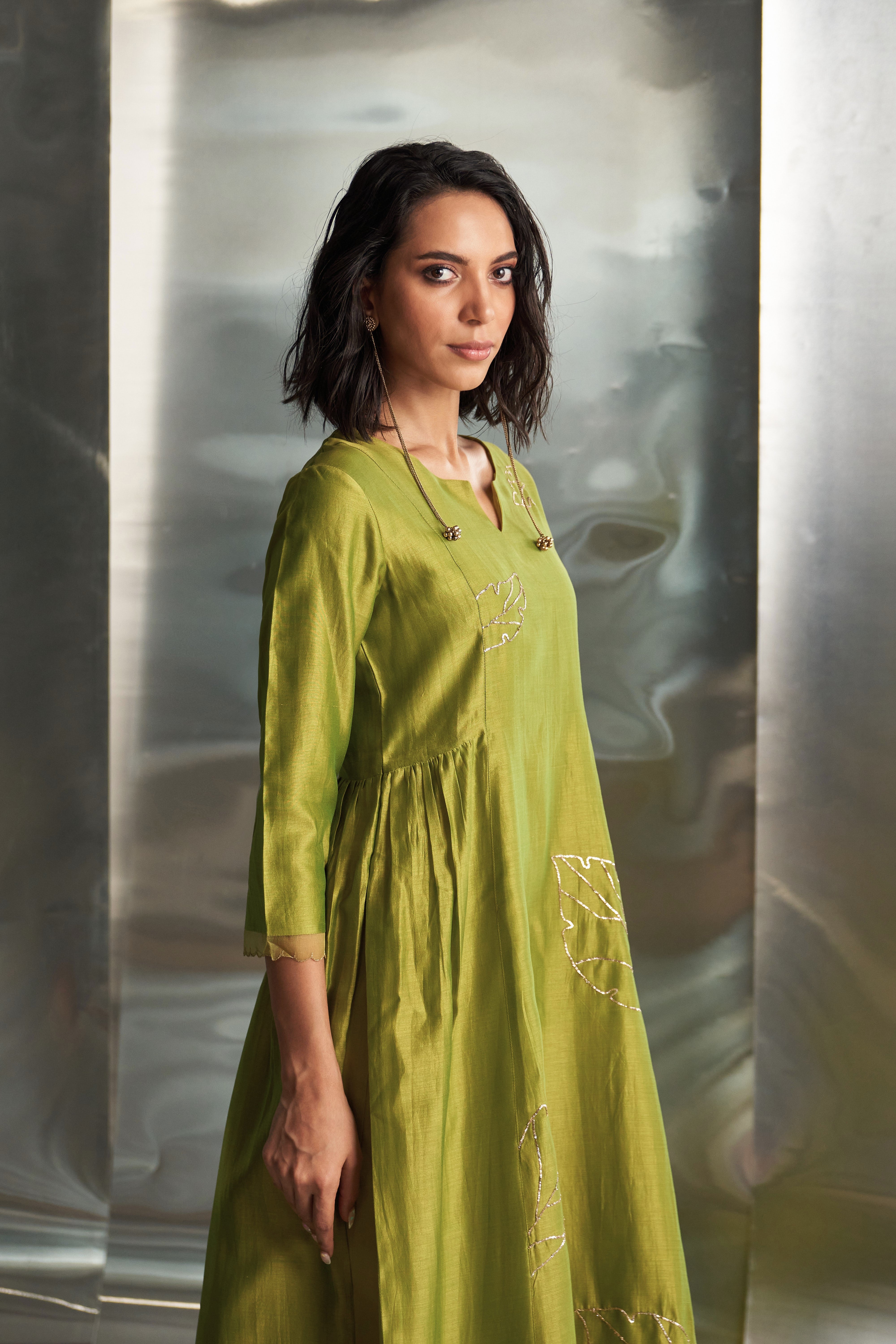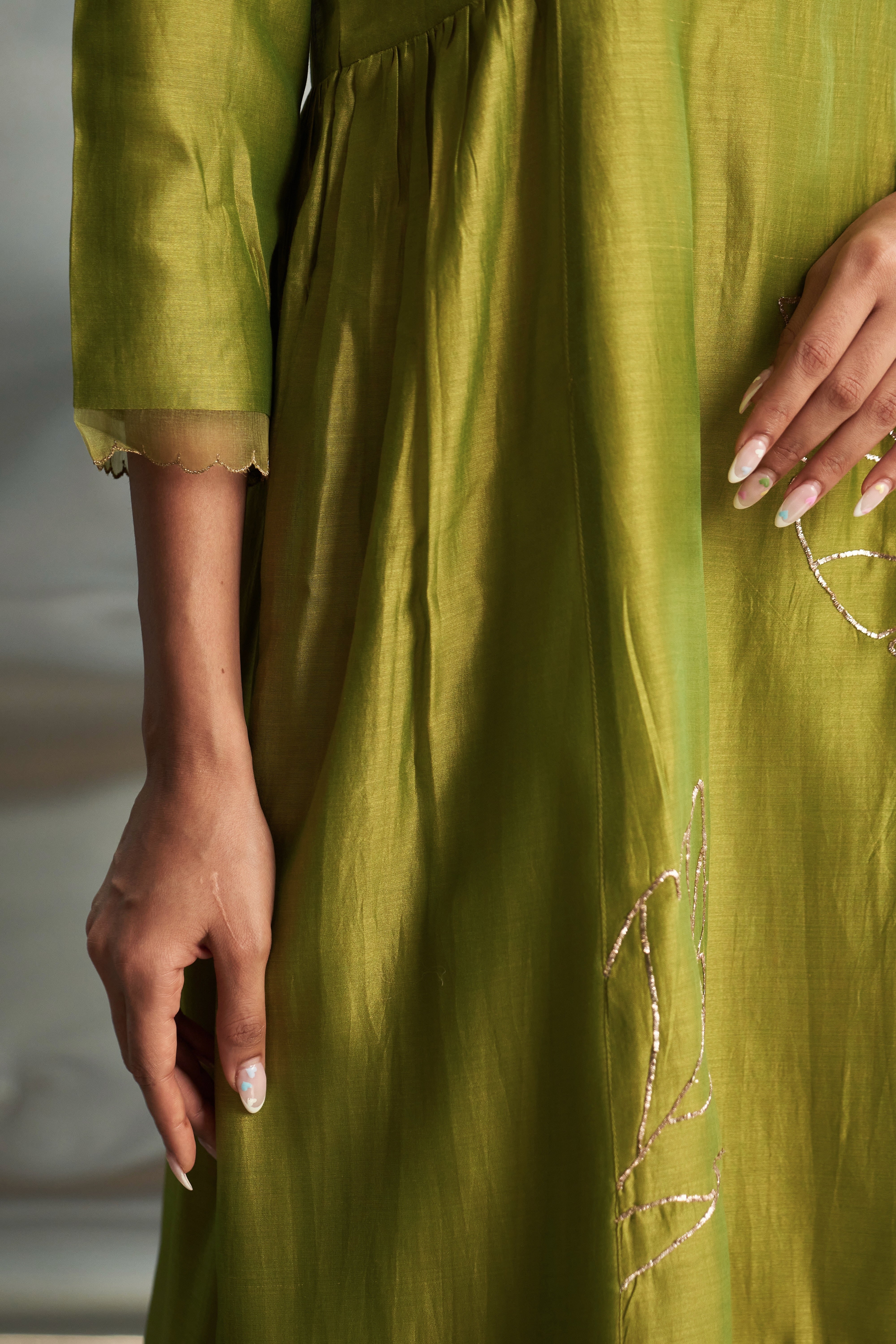 This berry green Chanderi kurta, featuring a light and flowing silhouette with intricate nakshi handwork, is a timeless piece. The ensemble is elevated by a dreamy pure organza dupatta adorned with nakshi handwork and a flowy bottom with scalloped edges, adding a glamorous touch to the overall look.