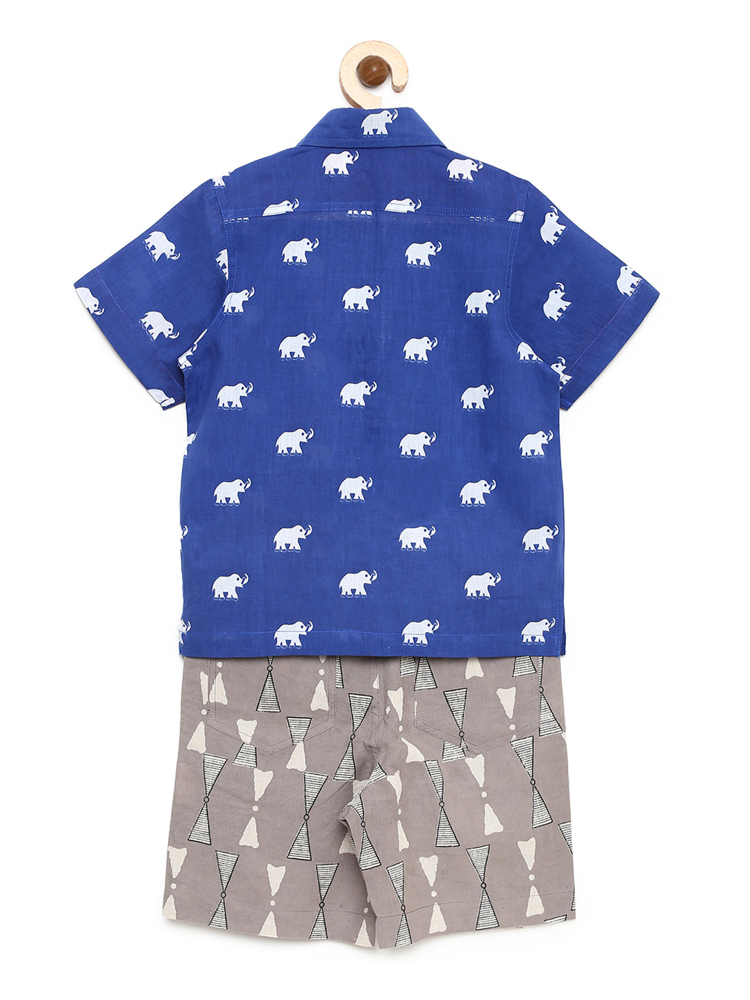 Blue elephant printed cotton shirt paired with quirky grey printed shorts. The combination makes for a funky look.