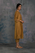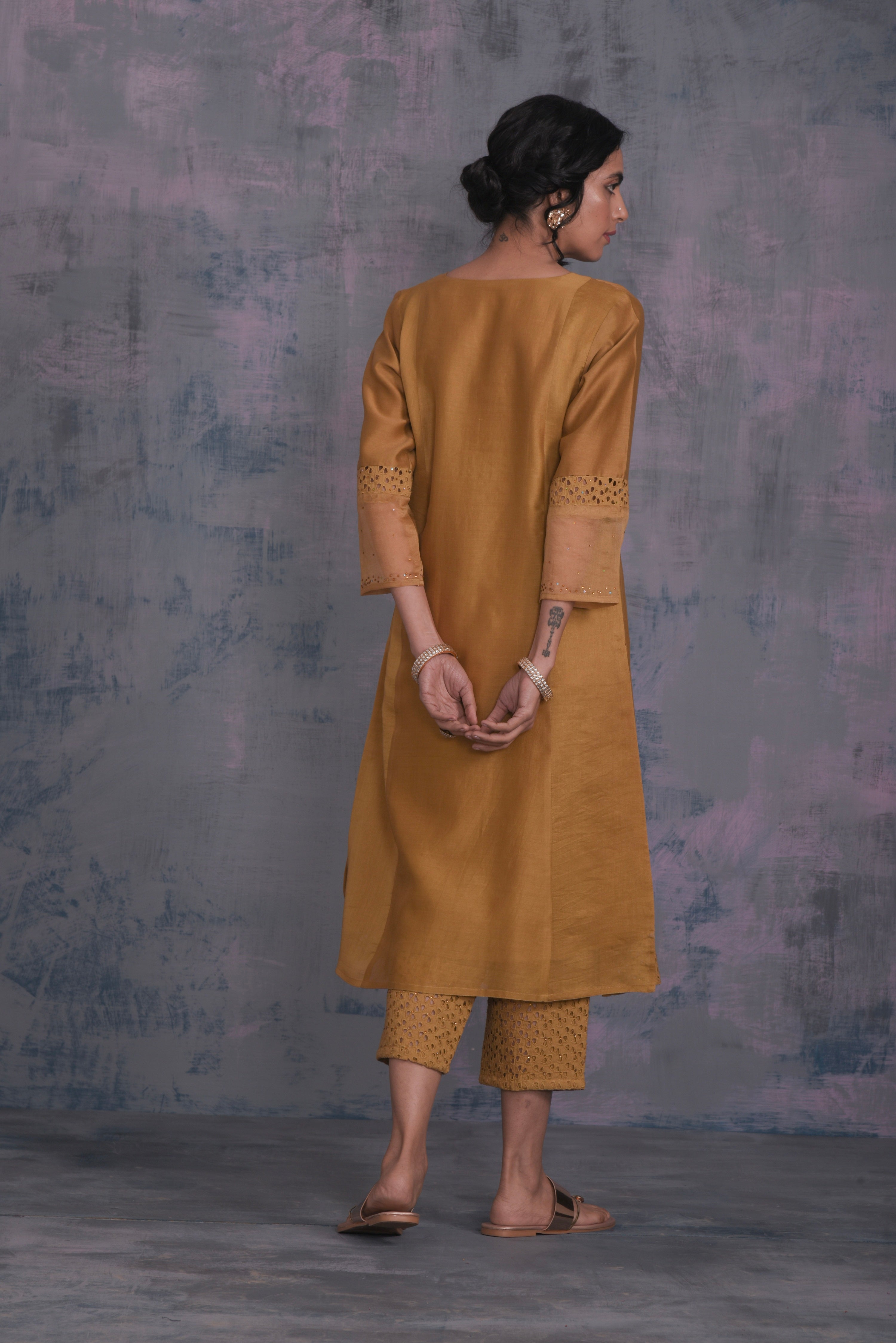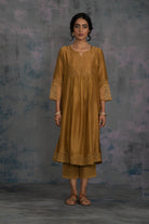 Chanderi golden kurta with swarovski work on yoke & sleeves. This front gathered kurta is paired with straight cutwork pants studded with swarovski and optional organza dupatta embellished with swarovski.