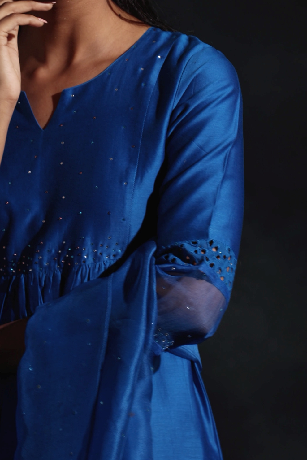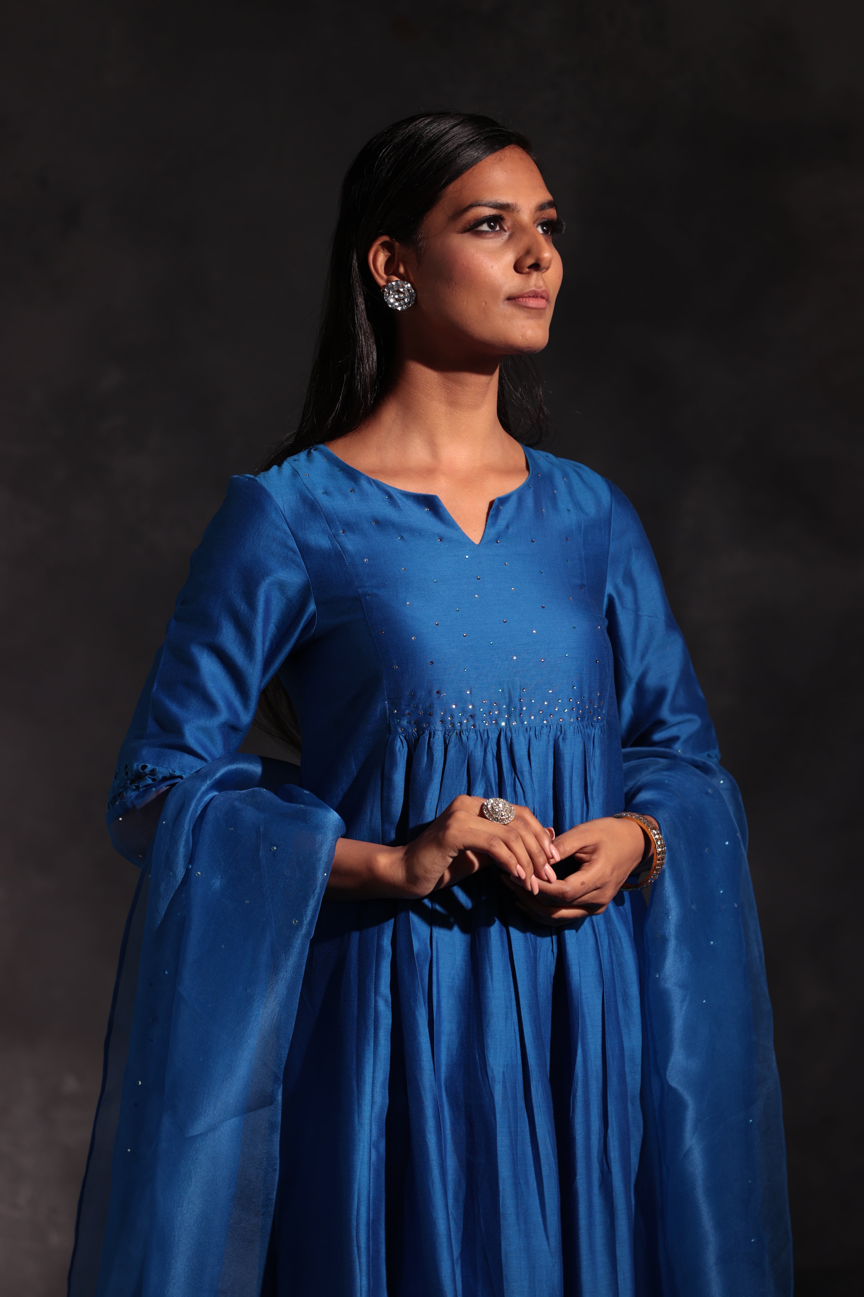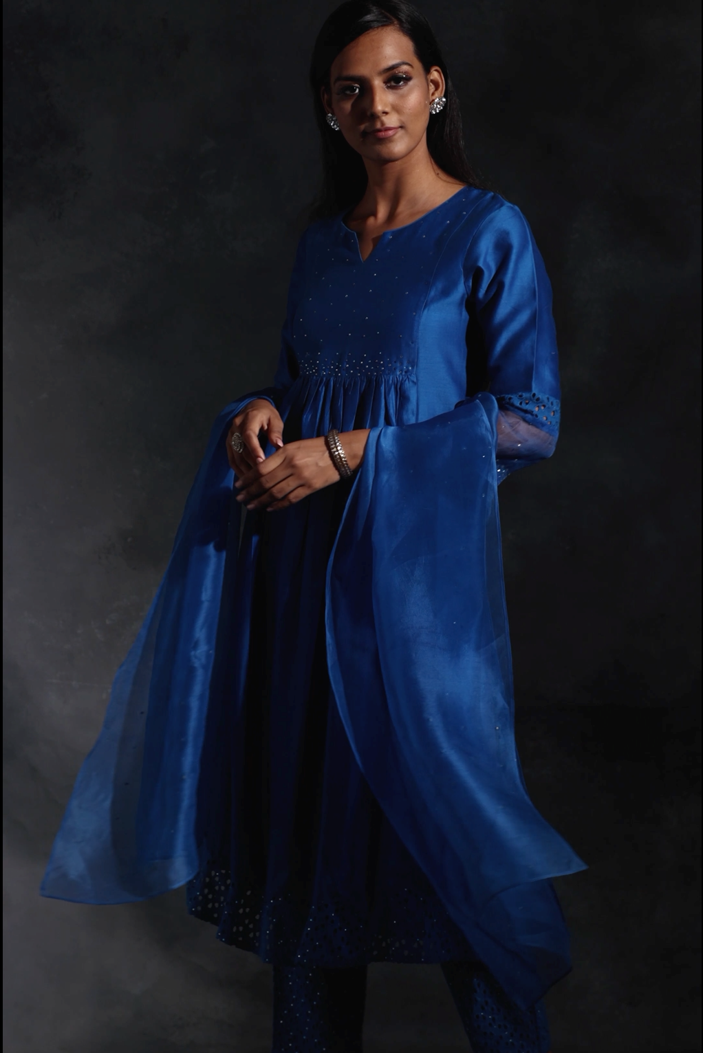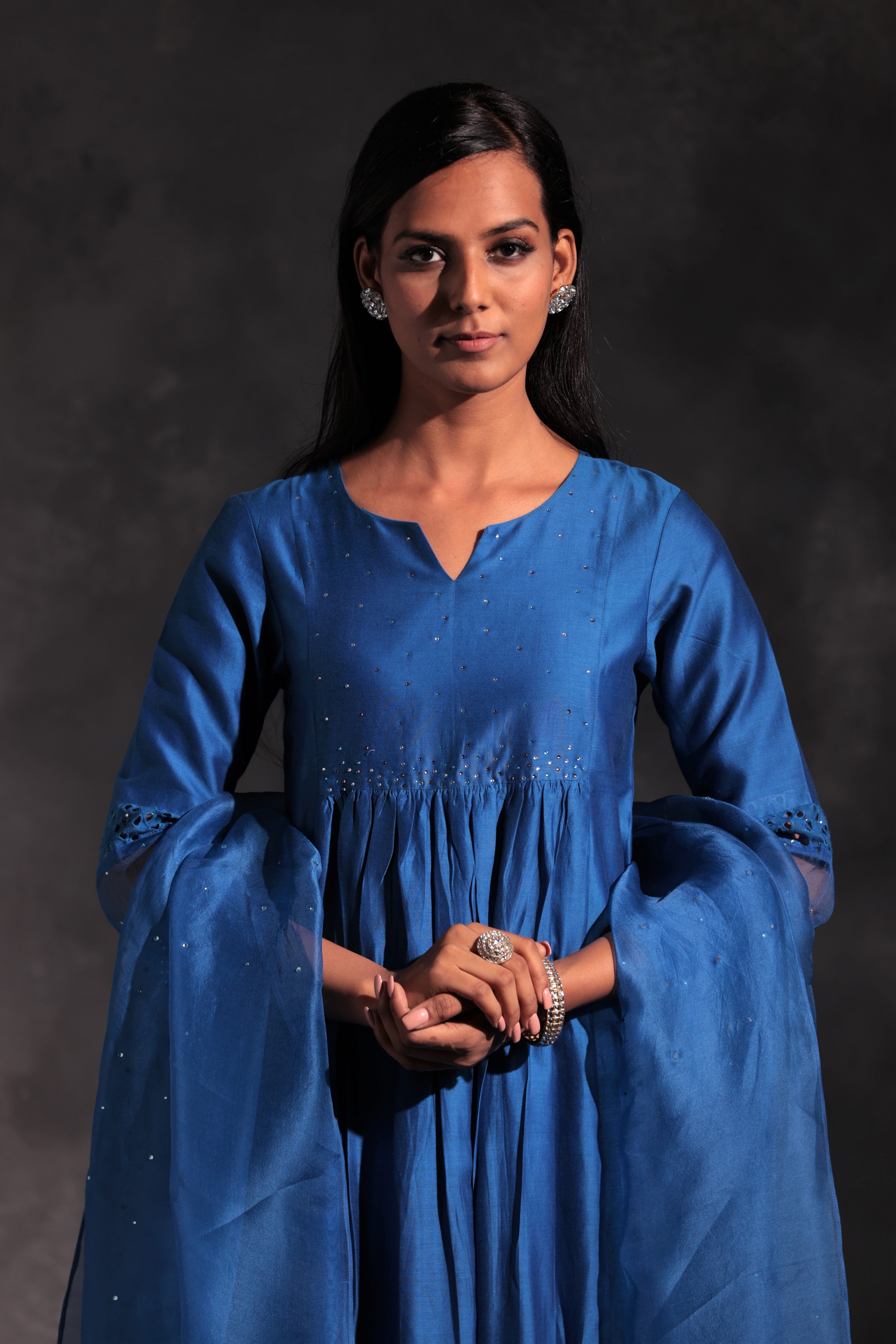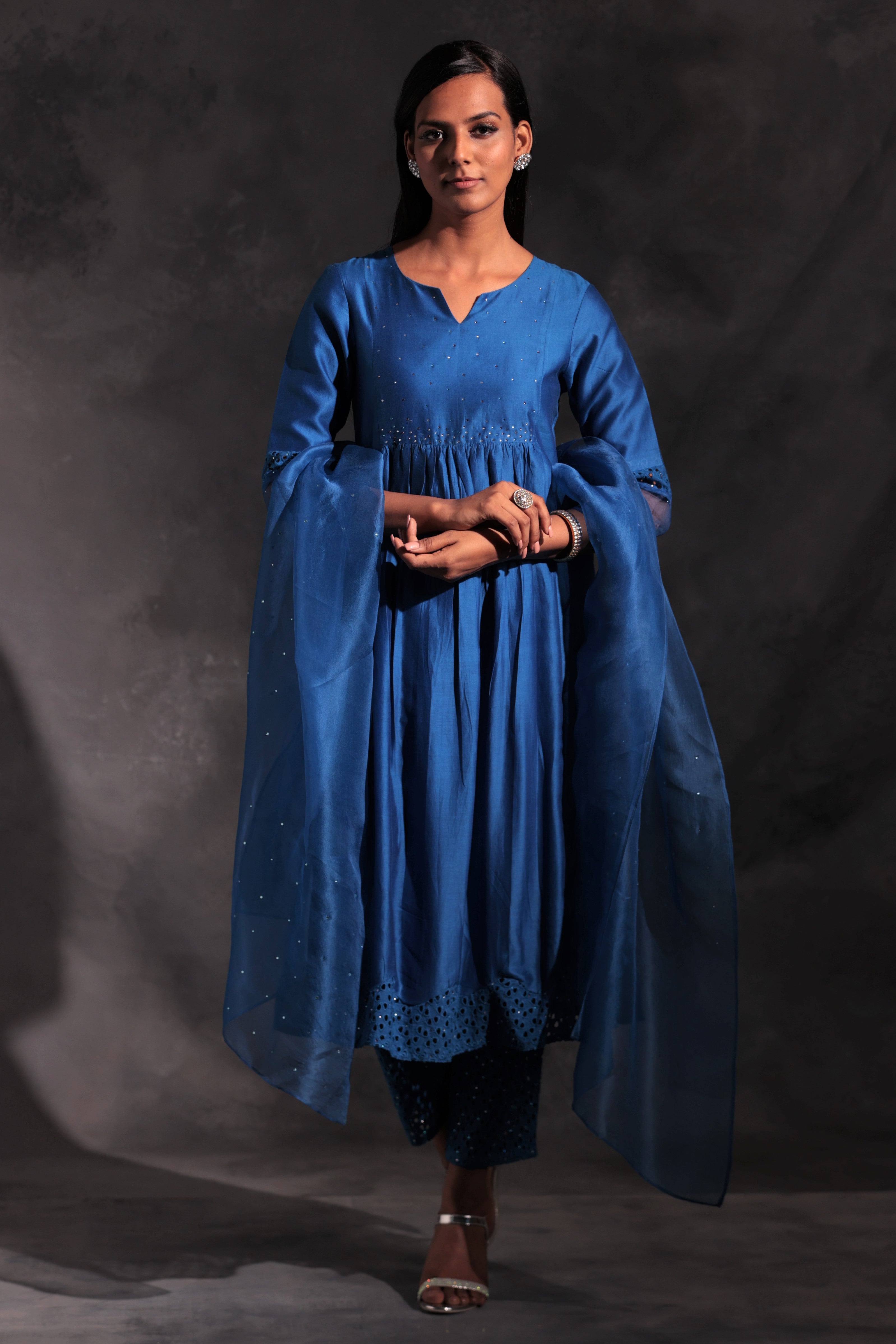 Chanderi egyptian blue kurta with swarovski work on yoke & sleeves. This front gathered kurta is paired with straight cutwork pants studded with swarovski and organza dupatta embellished with swarovski.