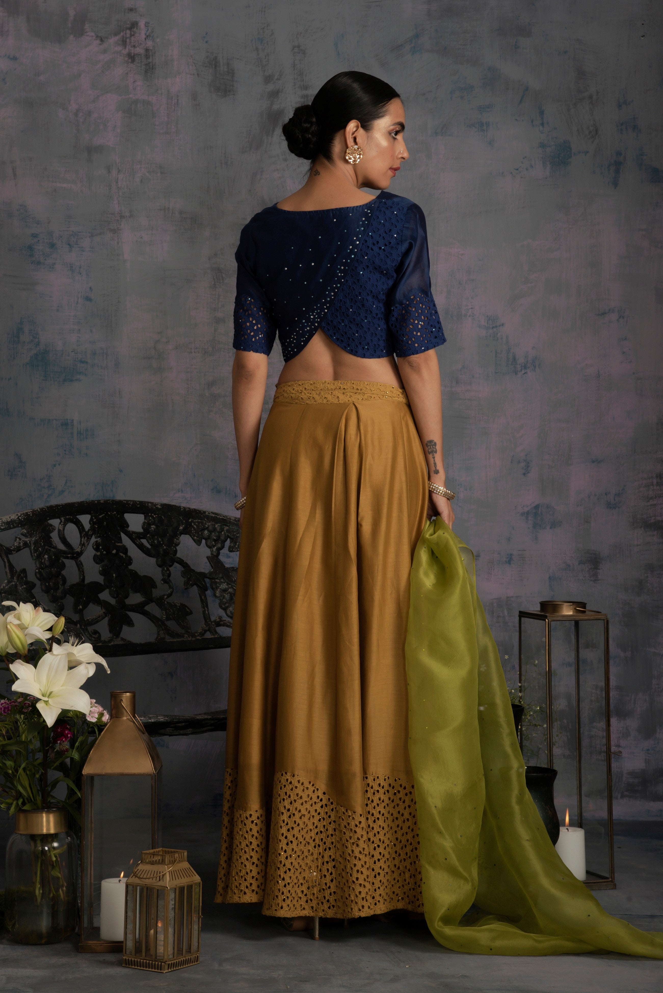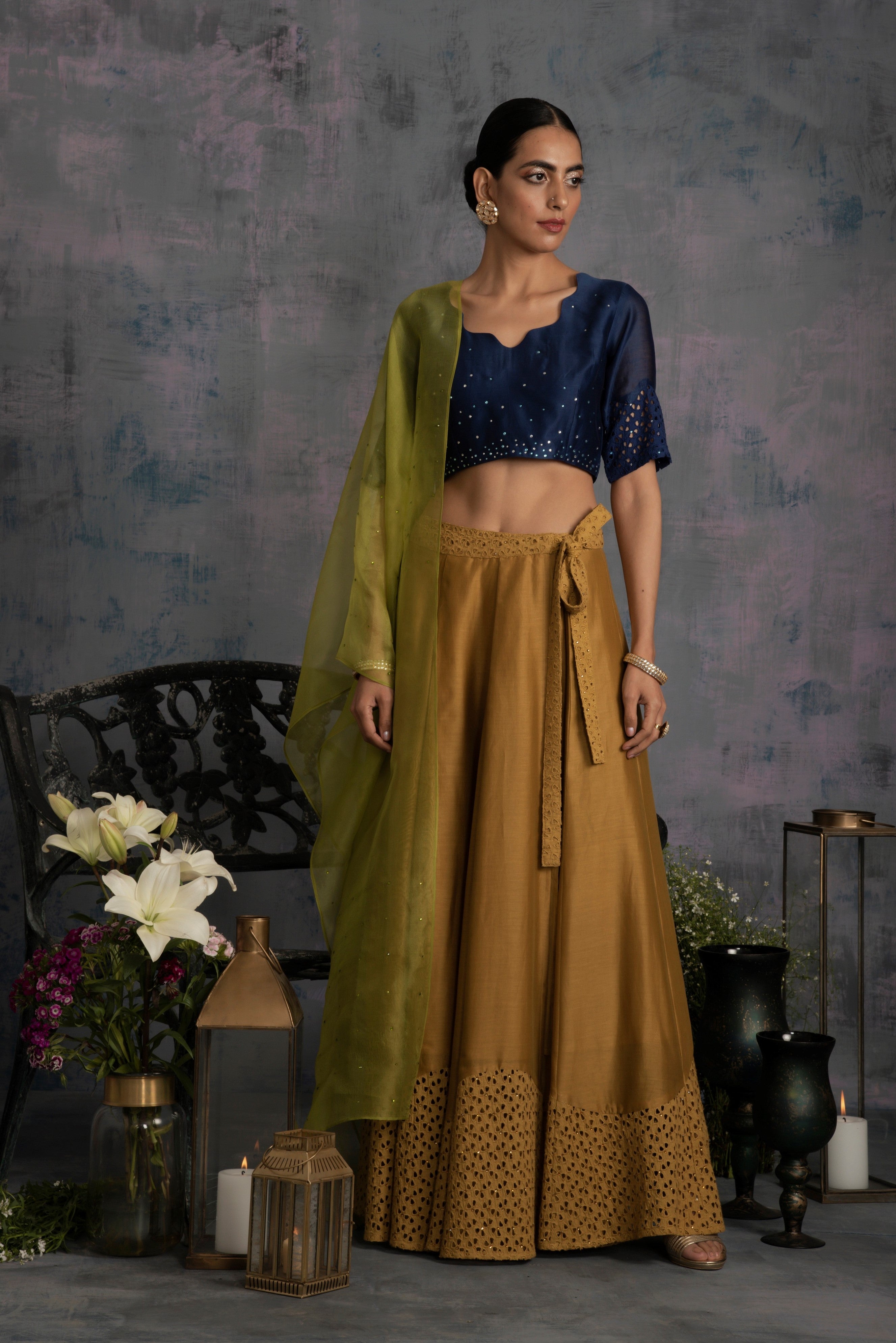 Chanderi wrap around Lehenga with cutwork at the bottom studded with swarovski. Chanderi full-sleeves blouse with a jagged neckline & studded with swarovski. This beautiful lehenga comes with organza green dupatta embellished with swarovski.