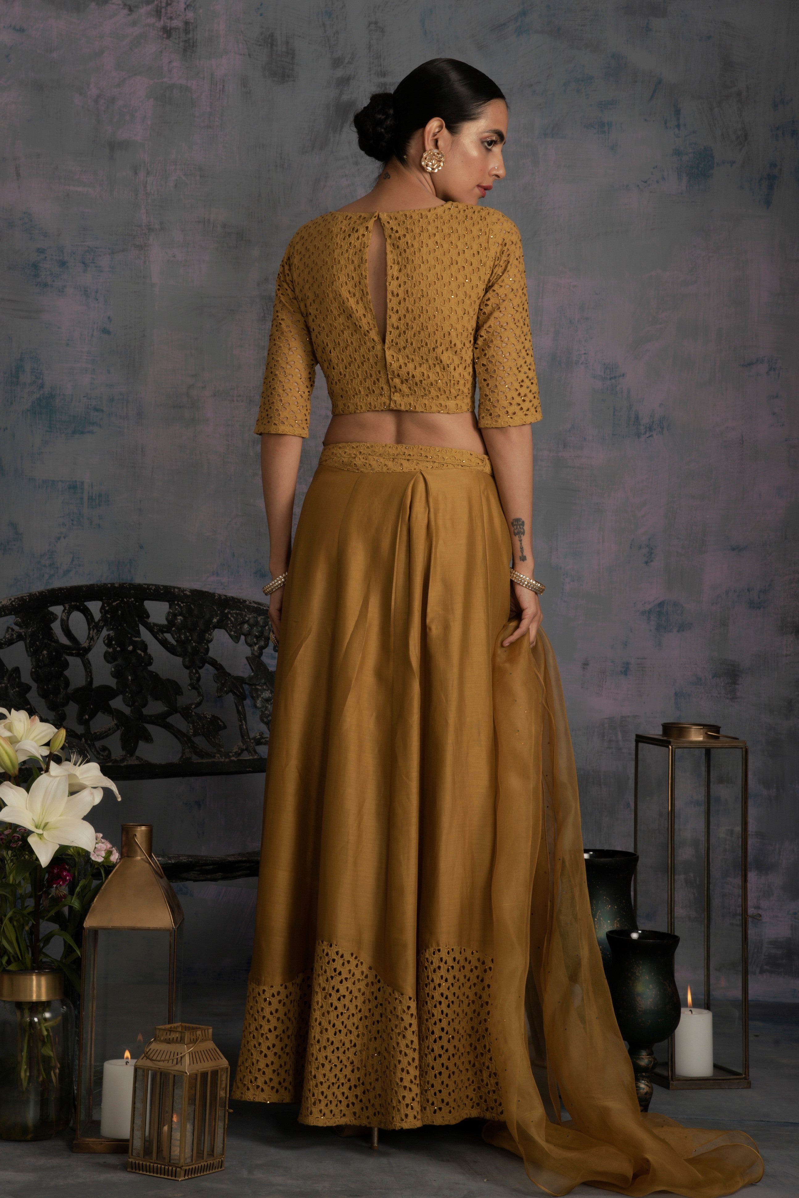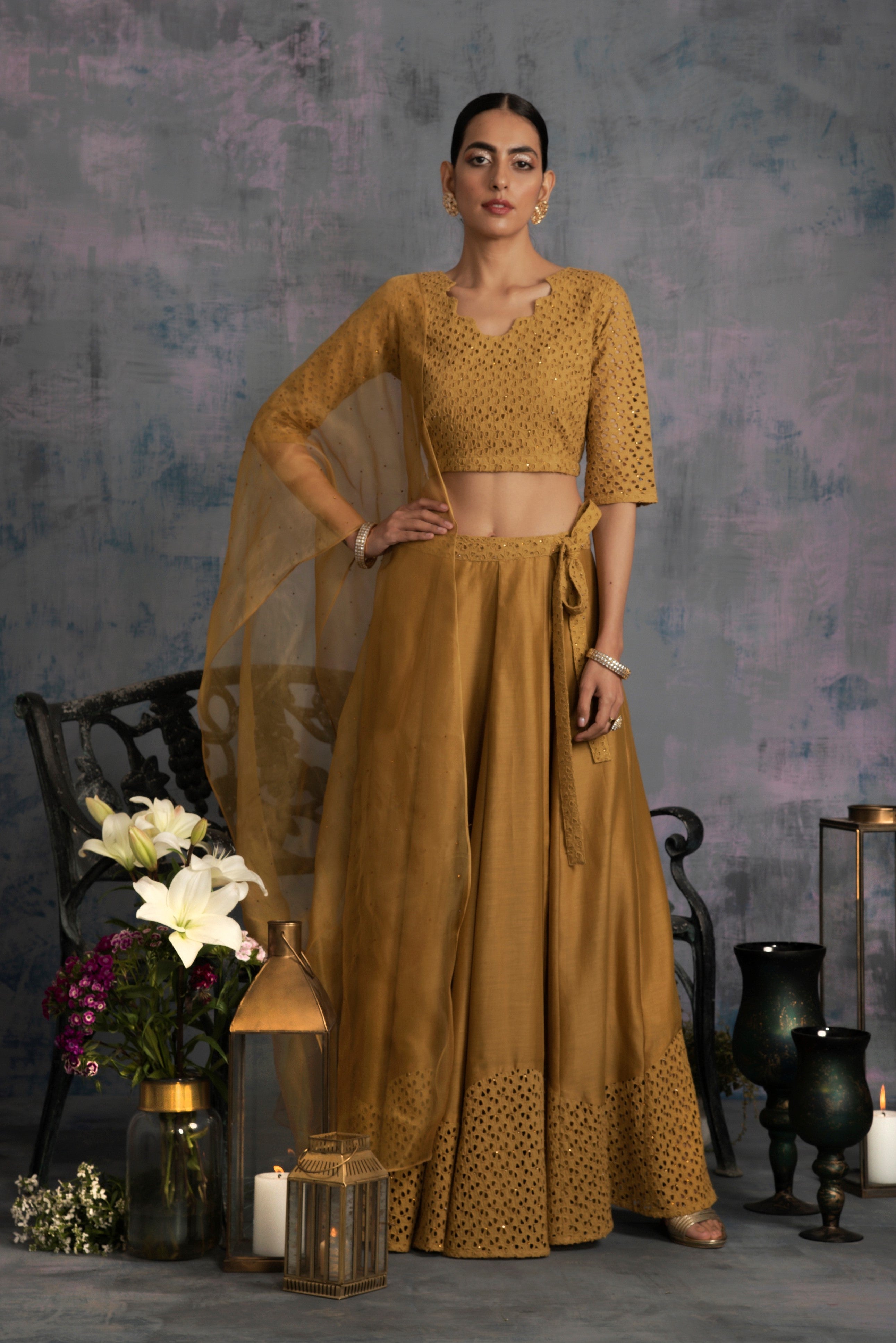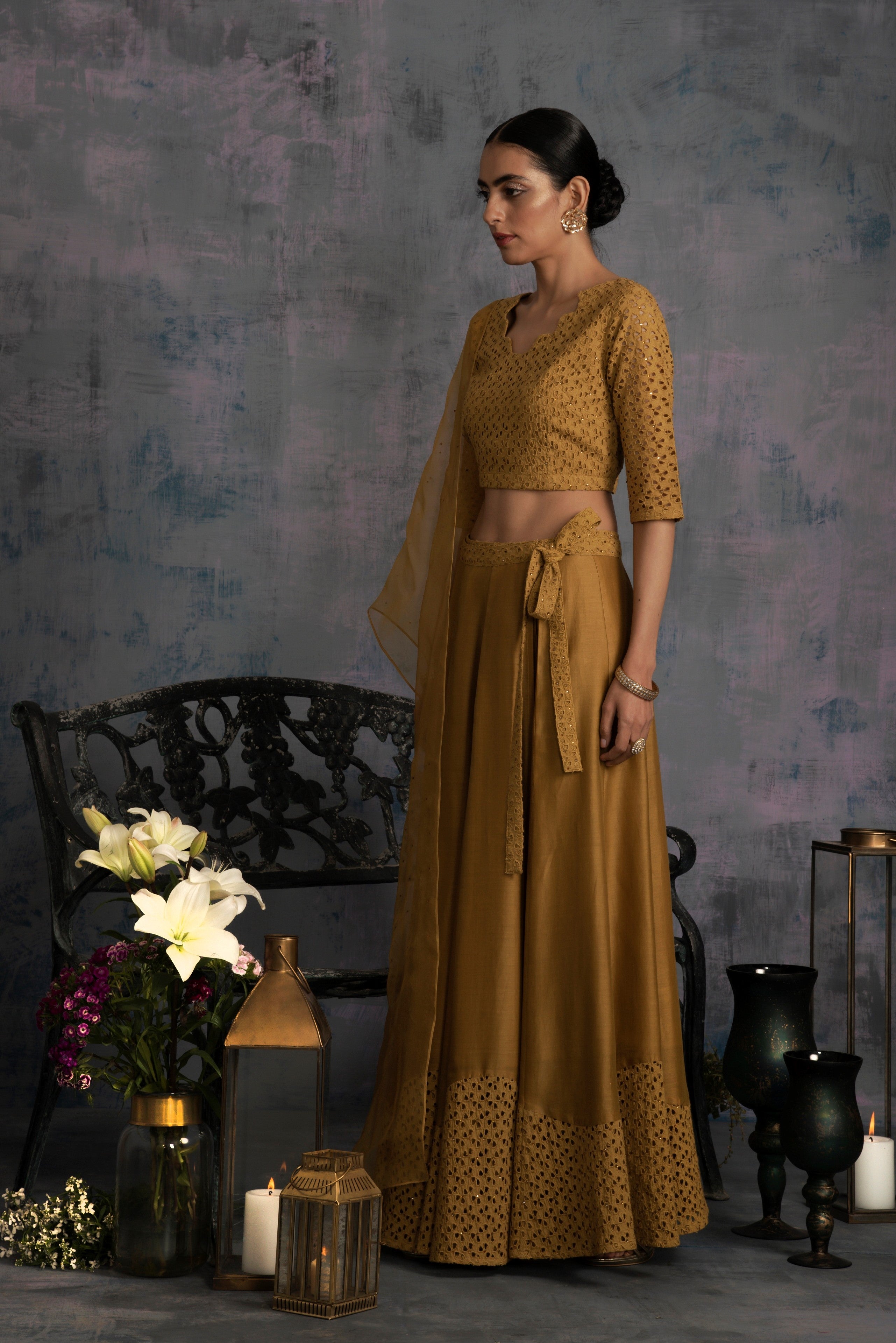 Swarovski Gold Chanderi Lehenga - Set of 3