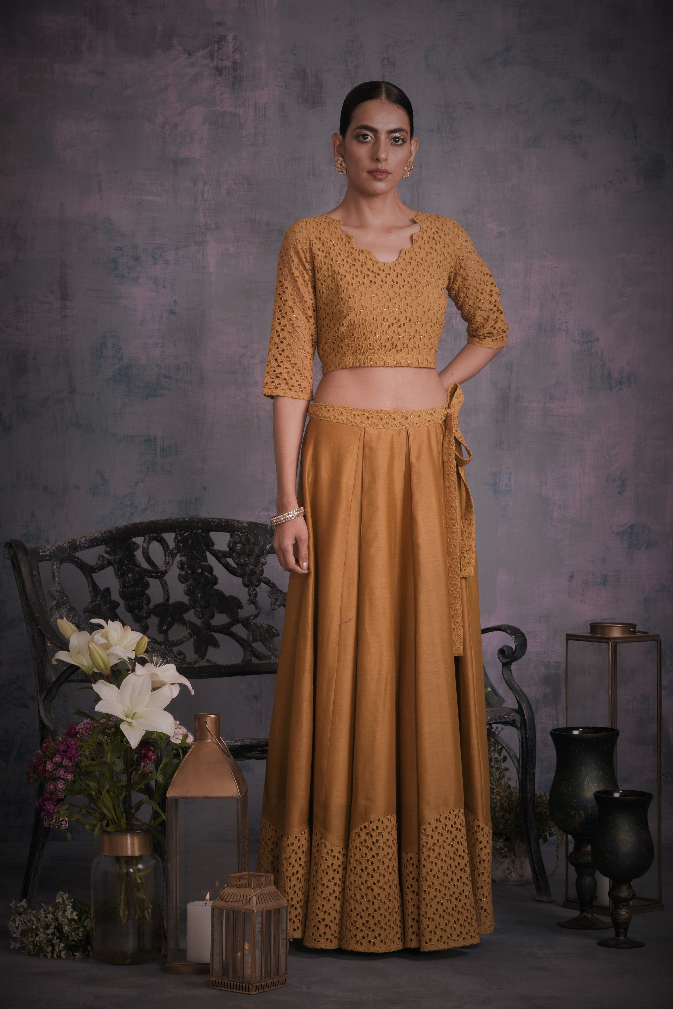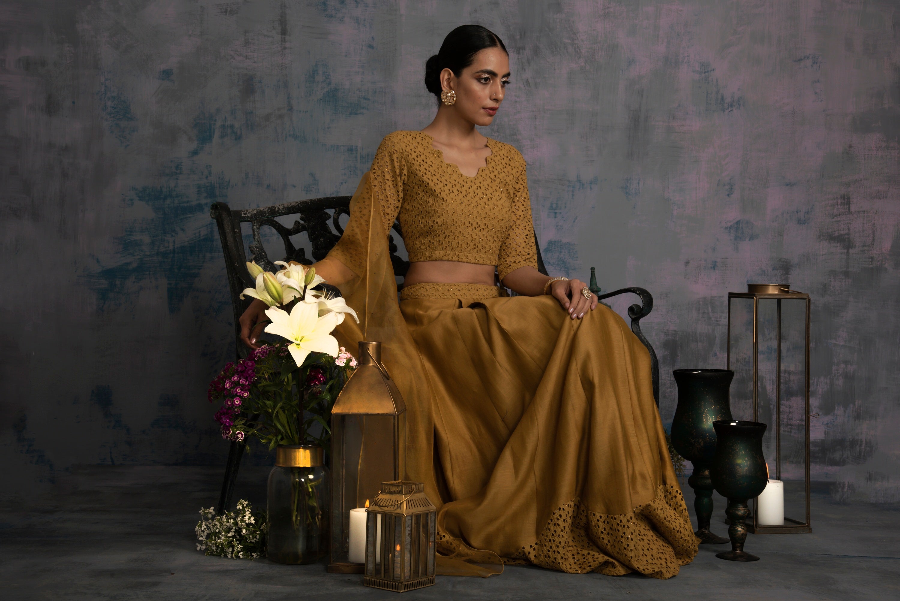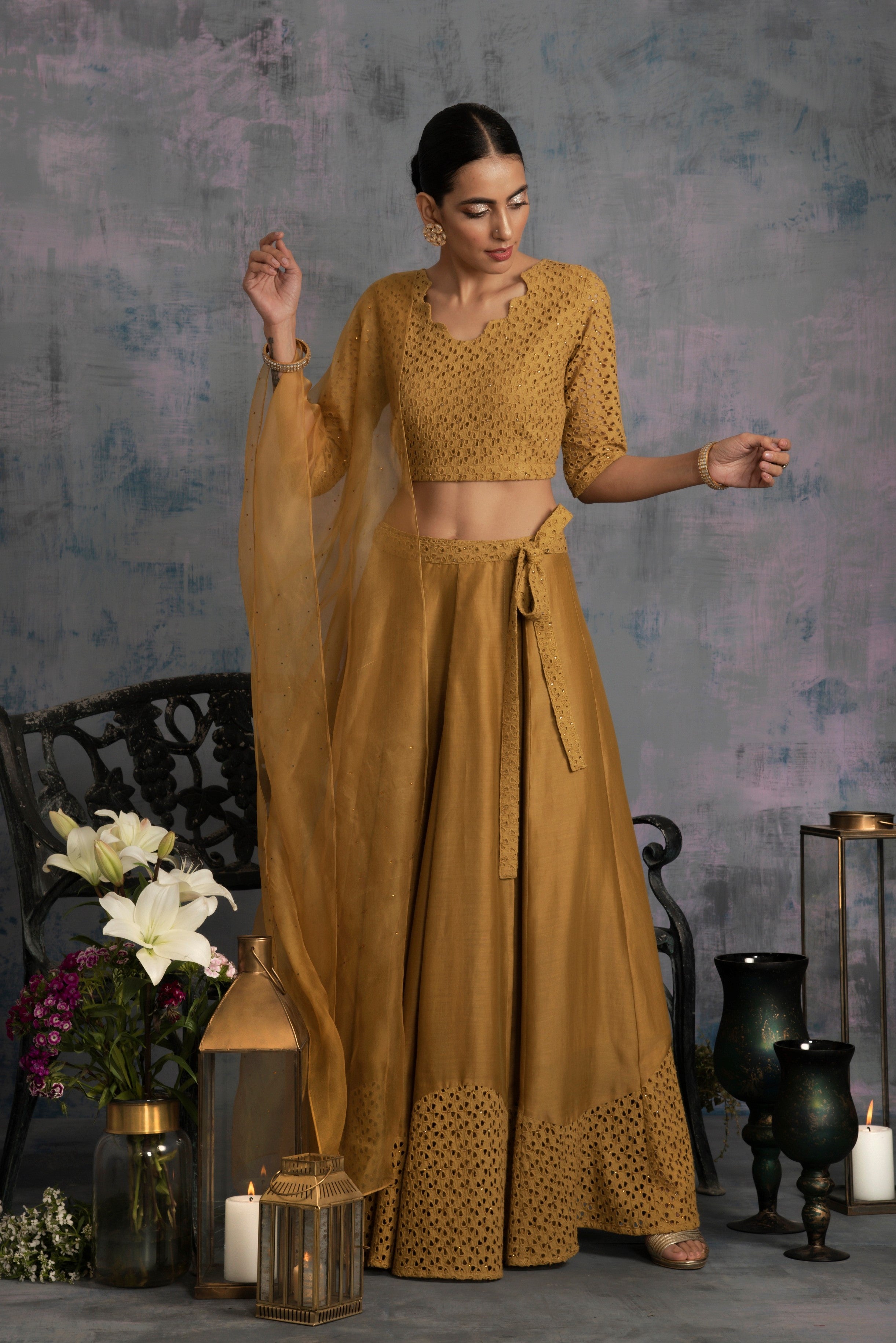 Swarovski Gold Chanderi Lehenga - Set of 3