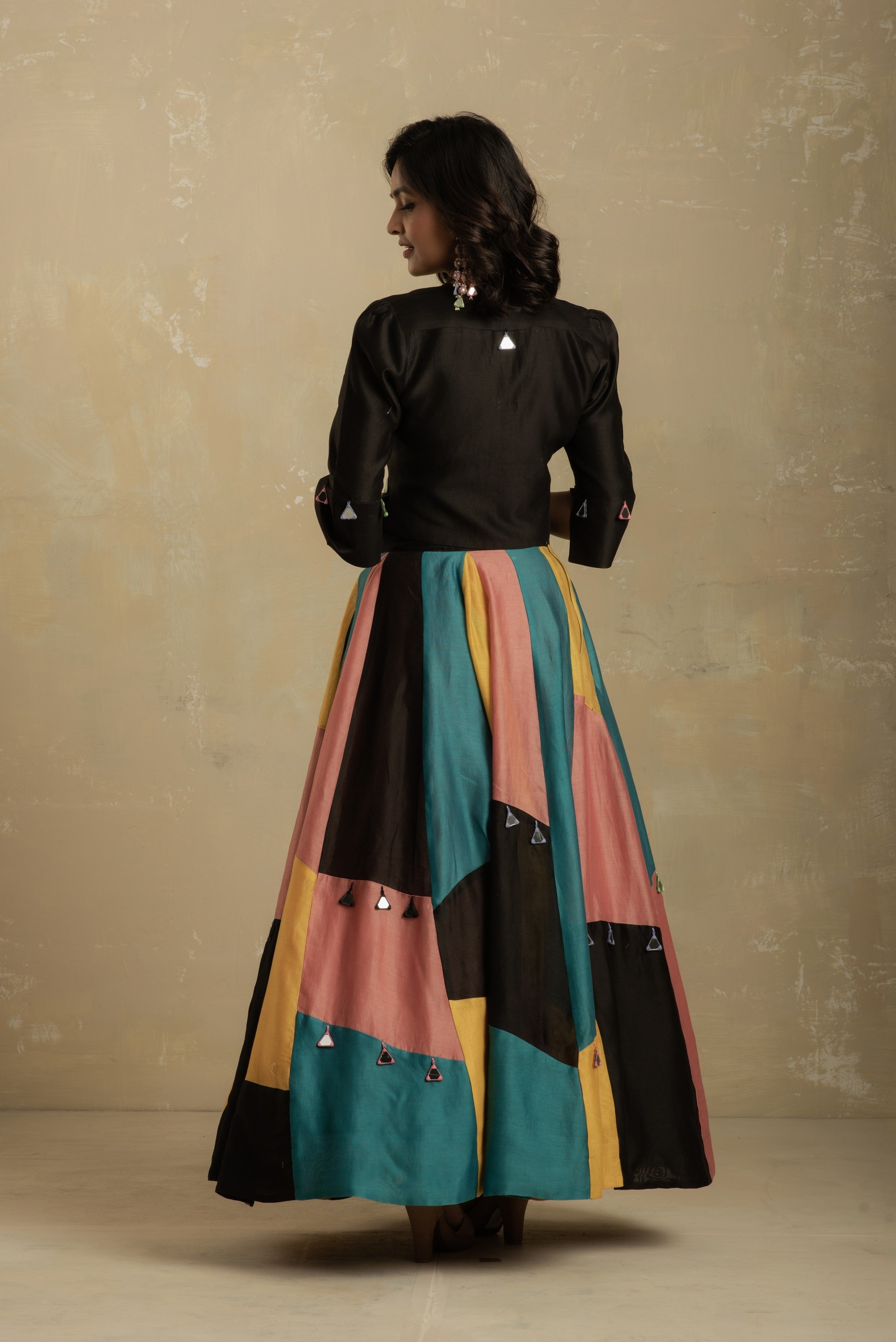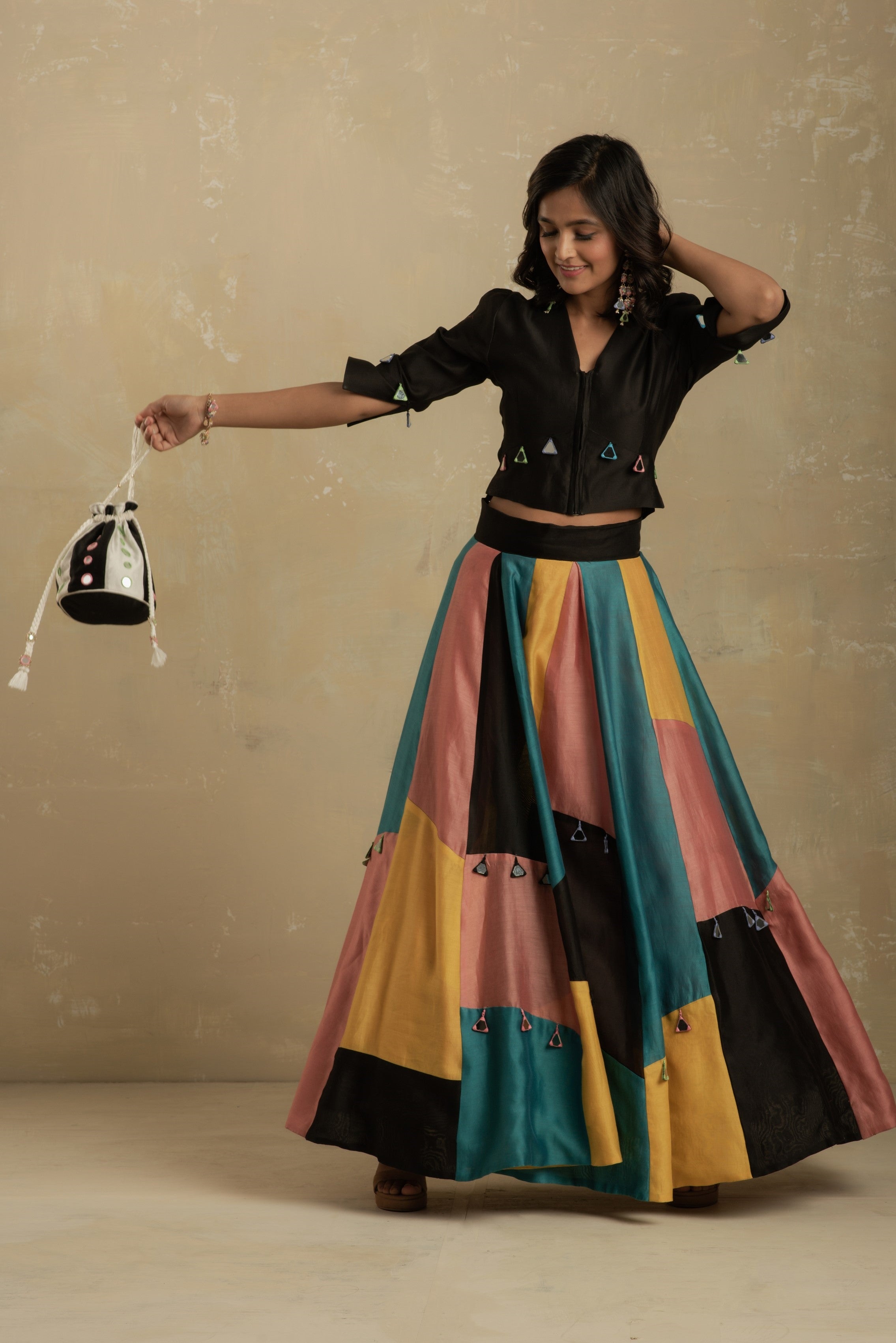 Chanderi multicolored flared lehenga with mirror hangings all over, paired with a jacket style blouse styled with a zipper opening and mirror hangings on waistline and cuff.