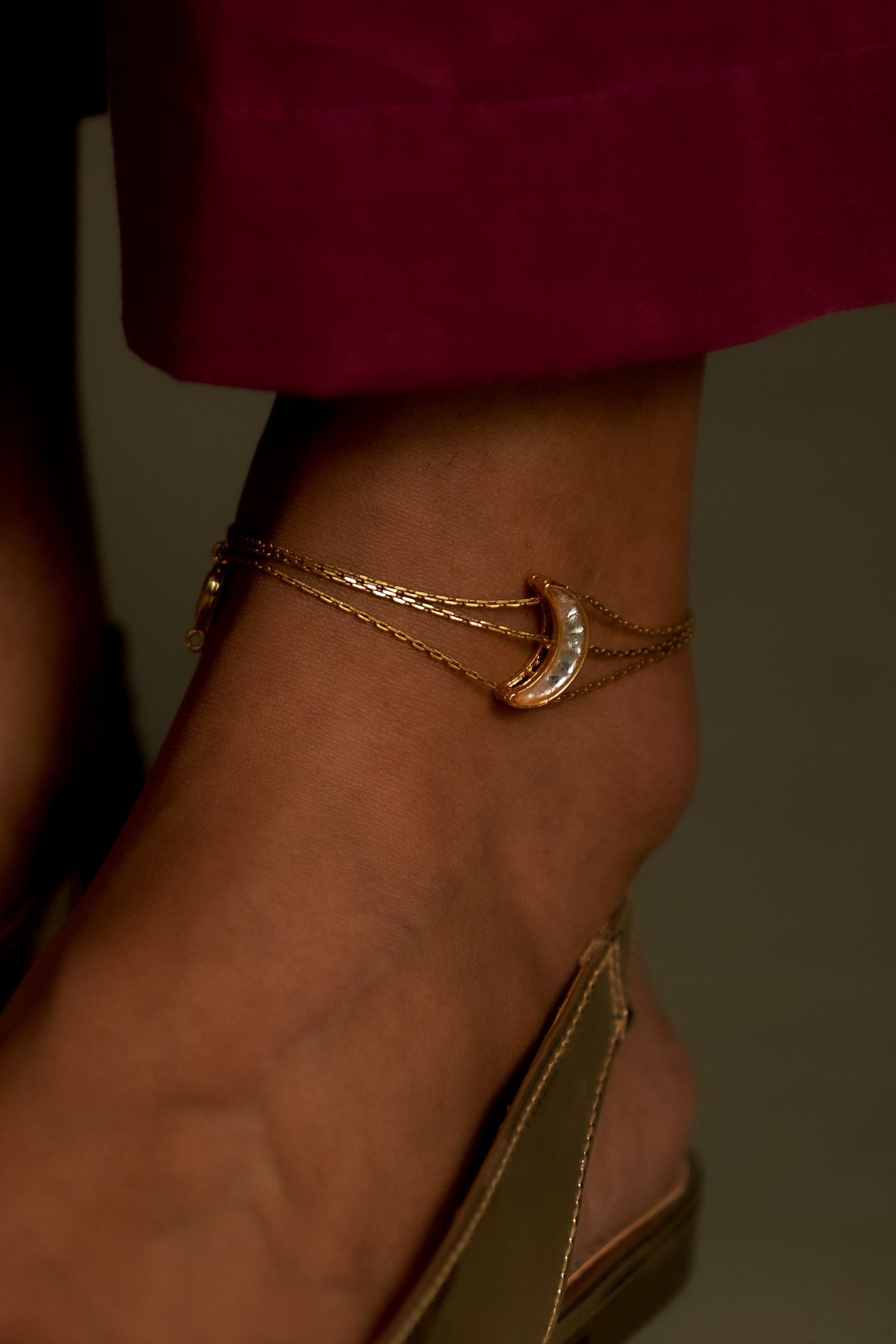 A multi-chain anklet adorned with a delicate kundan crescent, blending sparkling elegance with playful movement. Perfect for adding a subtle yet festive shimmer to every step