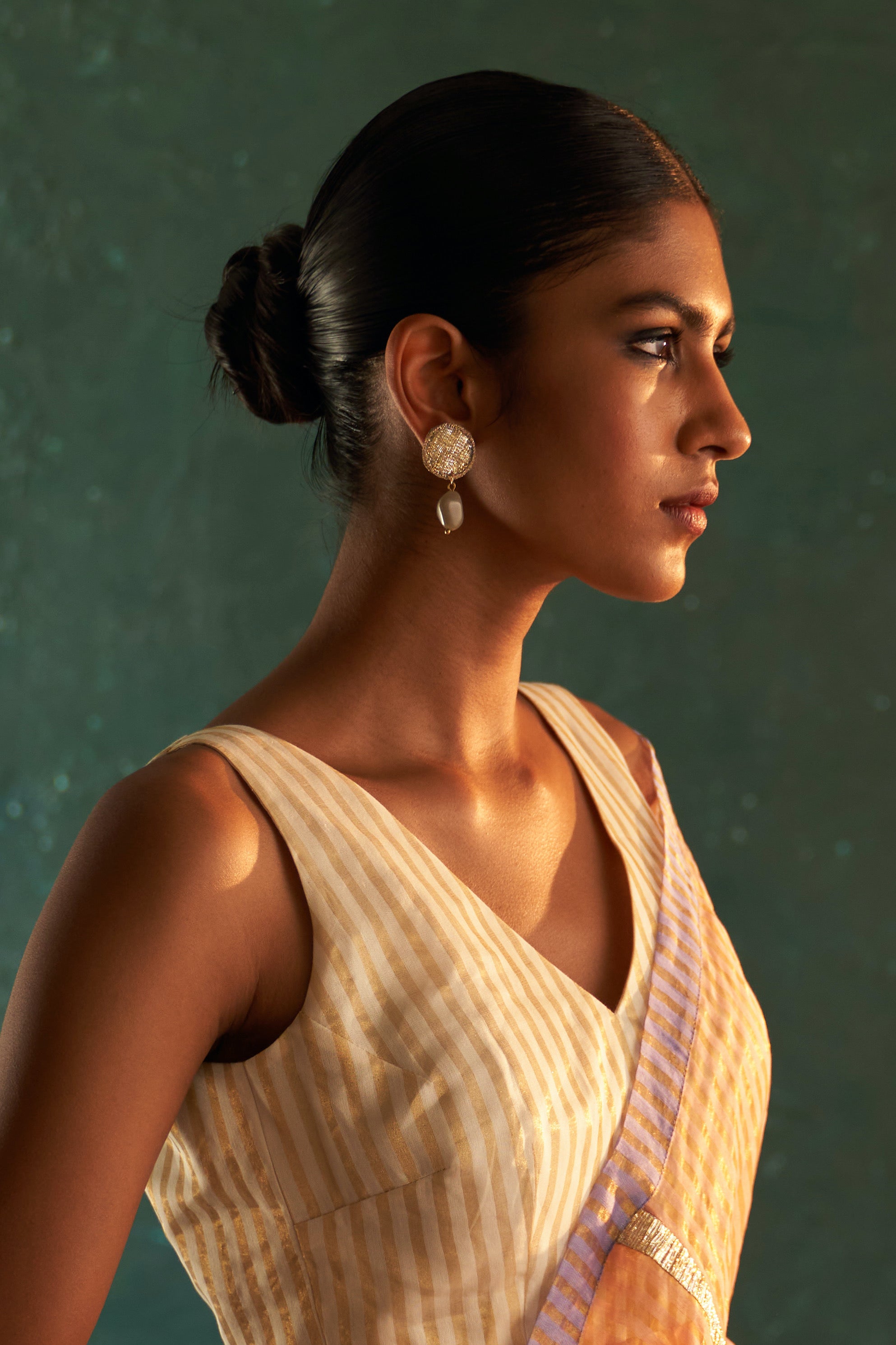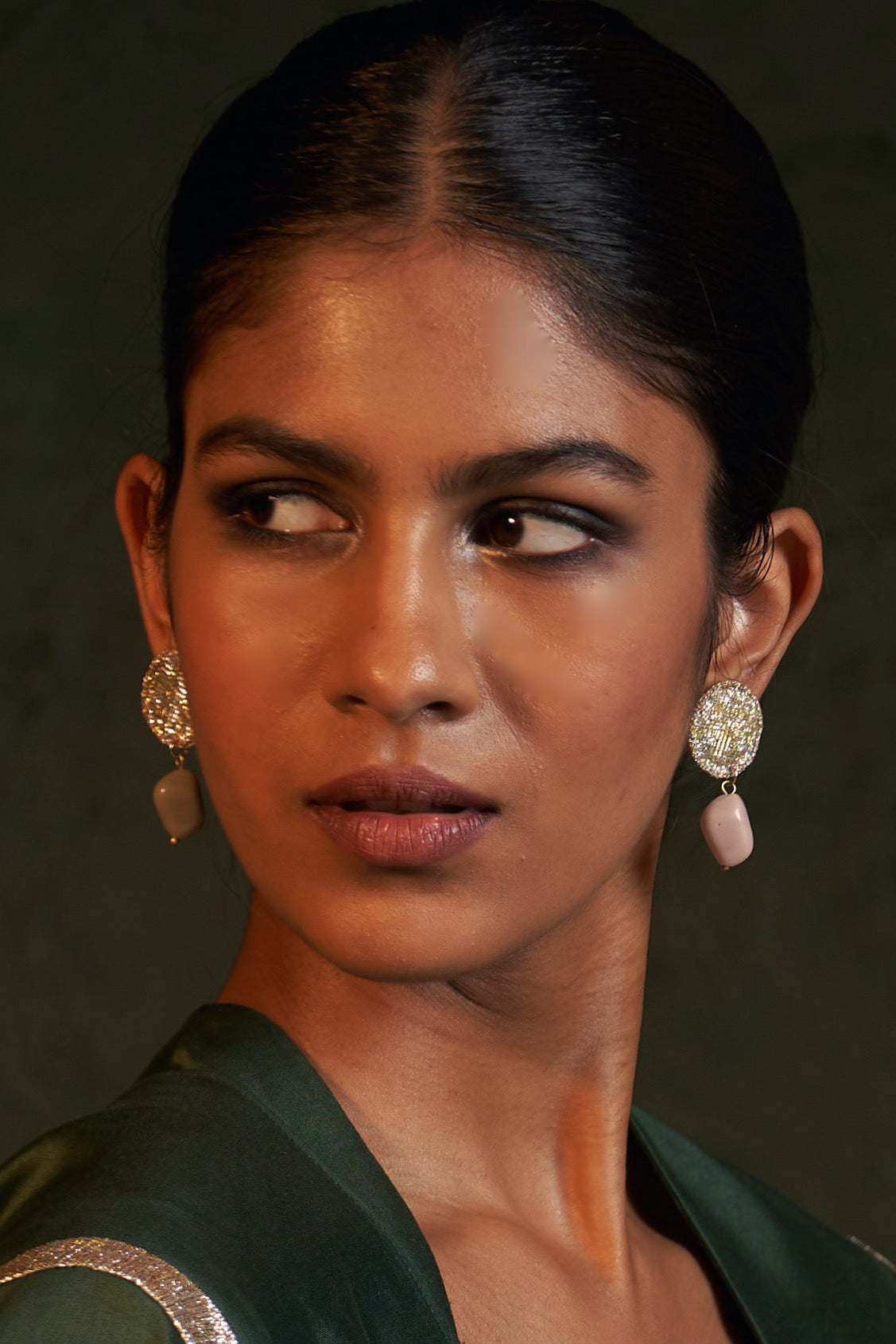 These luxurious earrings marry Classic Gold Tone with the enchantment of bejeweled gemstones. Artfully crafted in Gota and Zari, they imparts a swipe of panache and a hint of color to any ensemble - including a captivating adjustment of a Grey bead in one and a Pink bead in the other.
