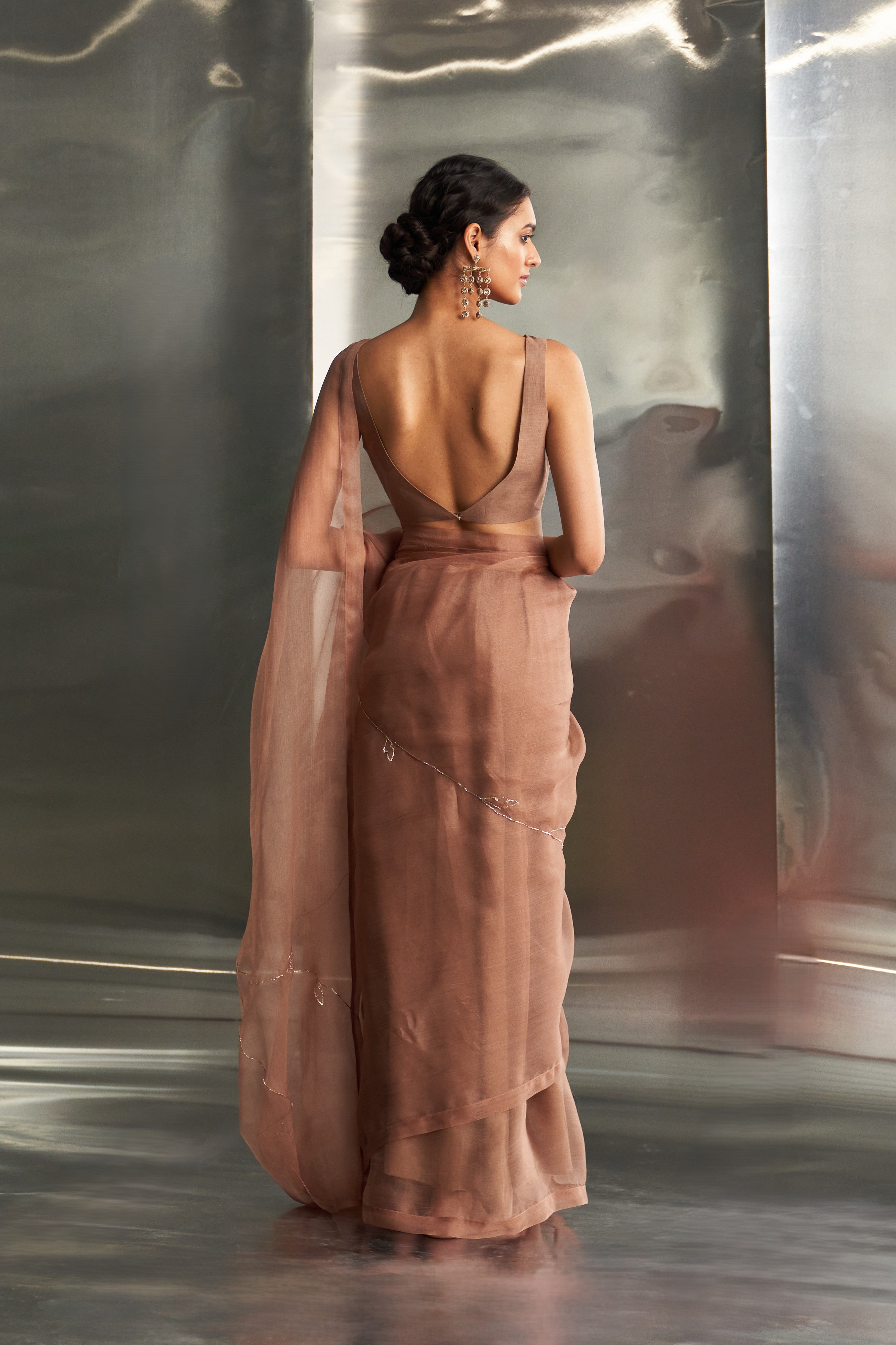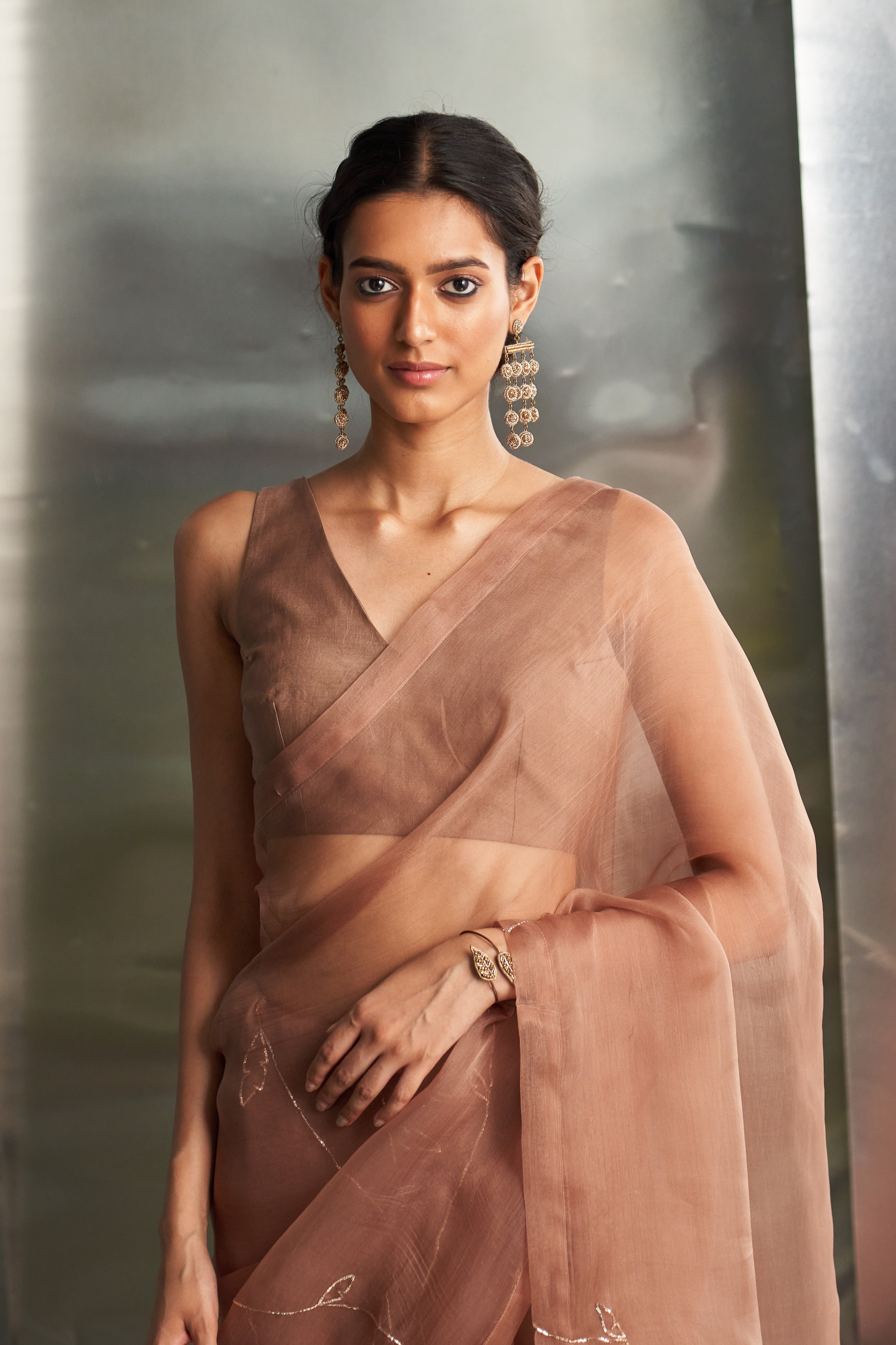 This exquisite saree, crafted from pure organza in a rich ginger hue, features intricate golden nakshi hand embroidery inspired by elegant leaf motifs. Accompanied by a deep-neck, sleeveless Chanderi blouse (padded) that adds a touch of glamour, this ensemble radiates timeless elegance.