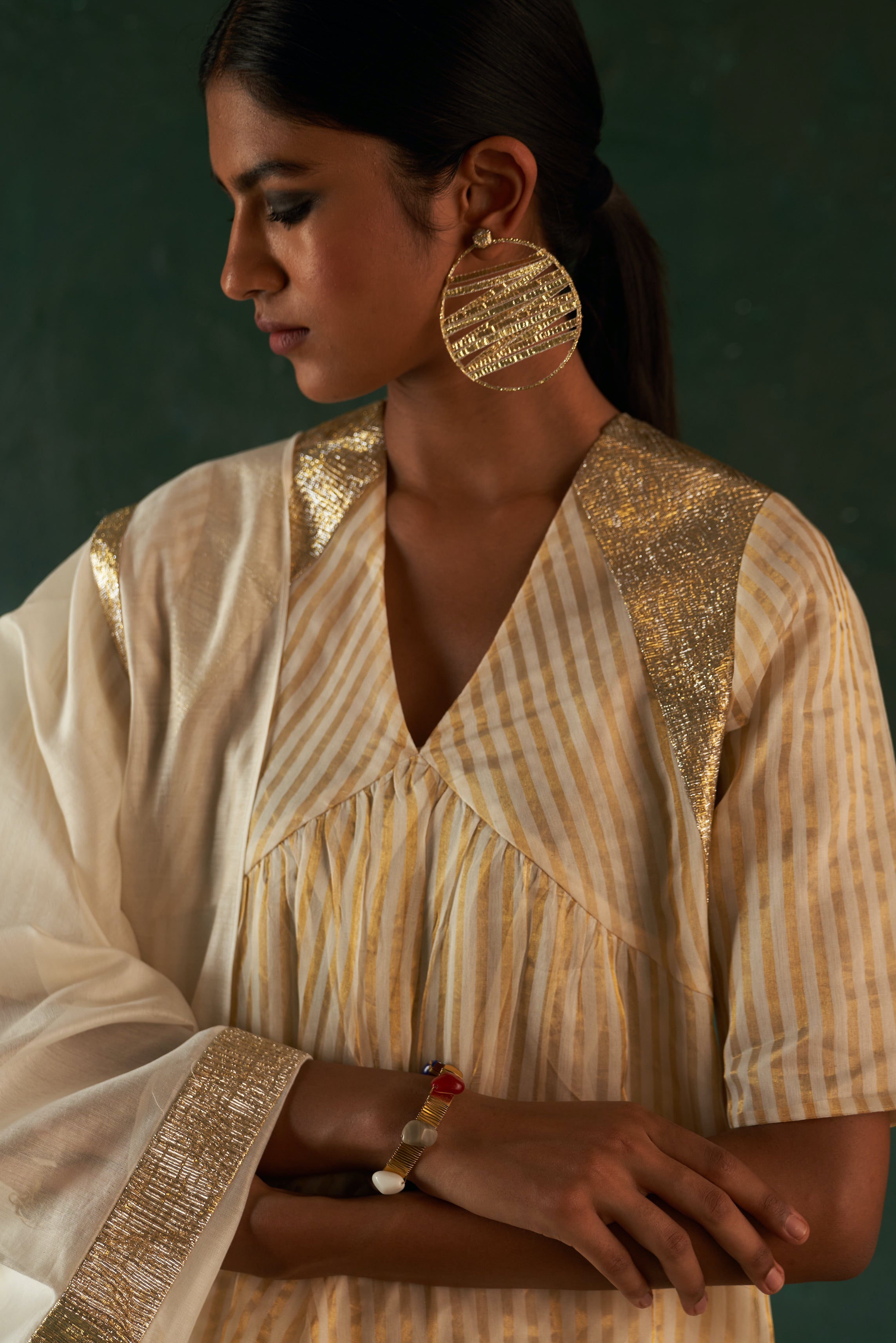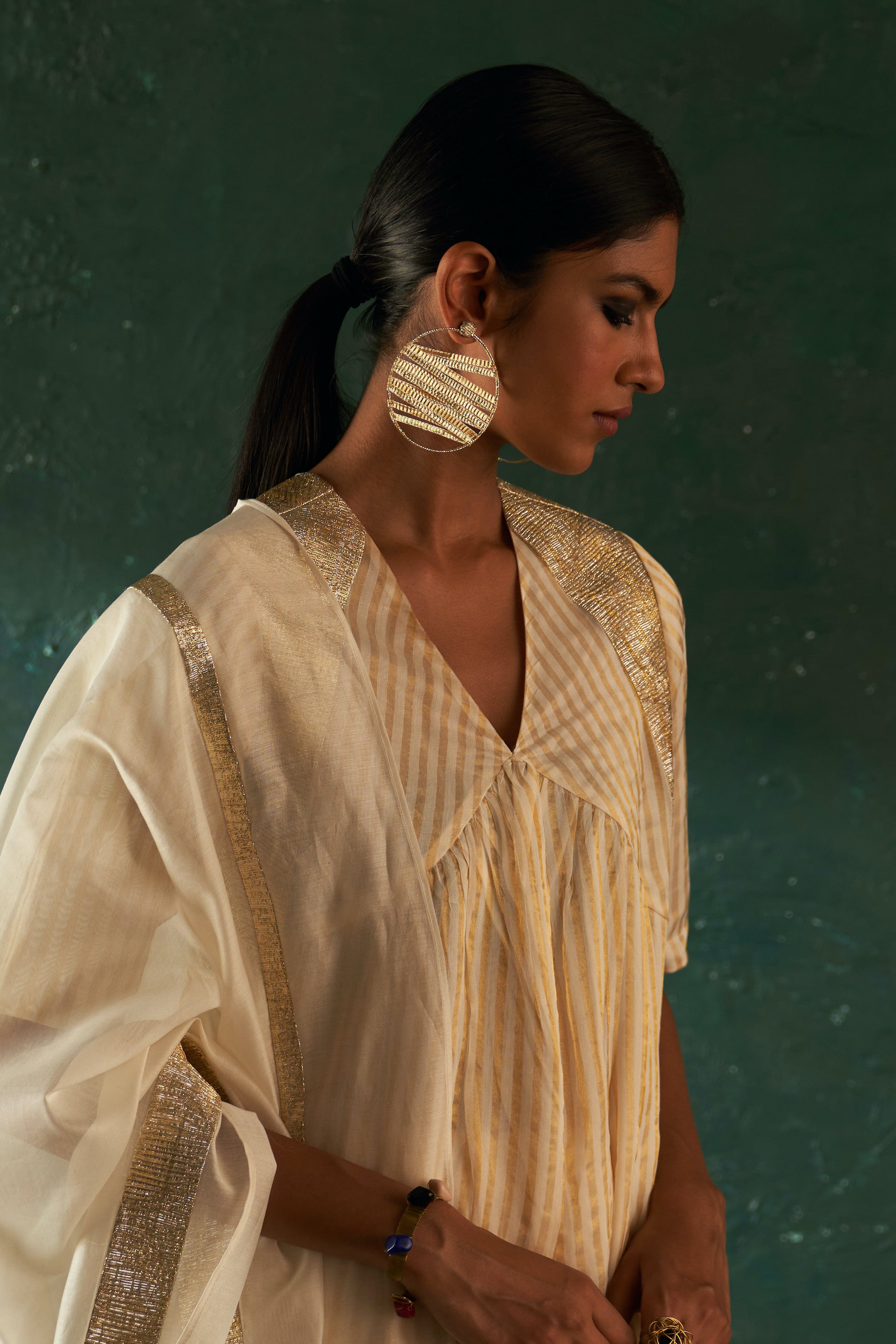 Make a statement with these decadent gold-hued gota earrings. Crafted in an opulent pattern with bold bali, they're sure to lend an extra flourish to your ensemble.