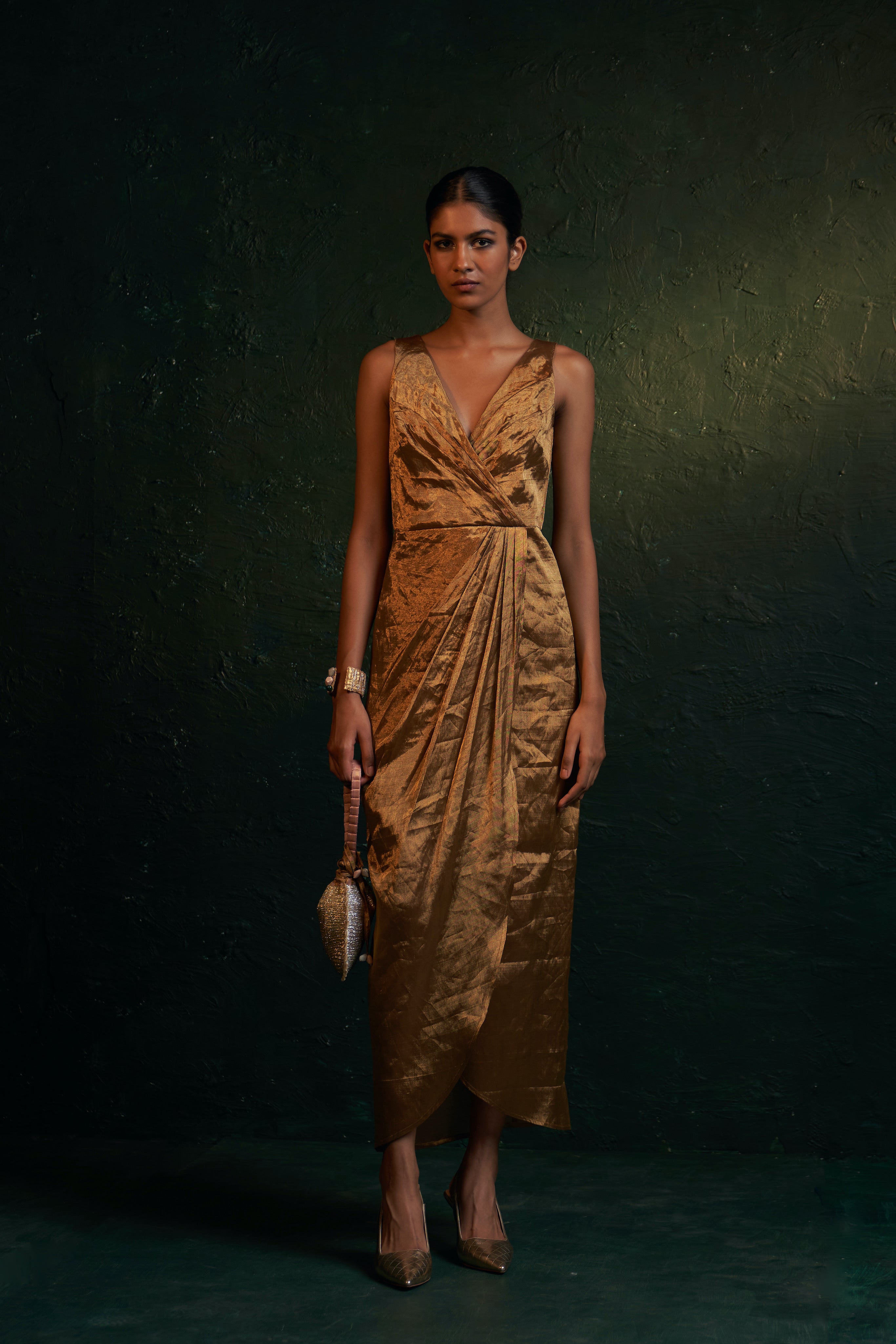 Must have is this gold tissue drape dress, simple yet chique that makes the heads turn while you walk like a diva in gold. The simple sophistication of this dress will give it an enduring grace in your wardrobe. Style it with our gota potli shimmer bag or our twisted knot Neckpiece to enhance your look. This dress is perfect for a cocktail or any other formal event.
