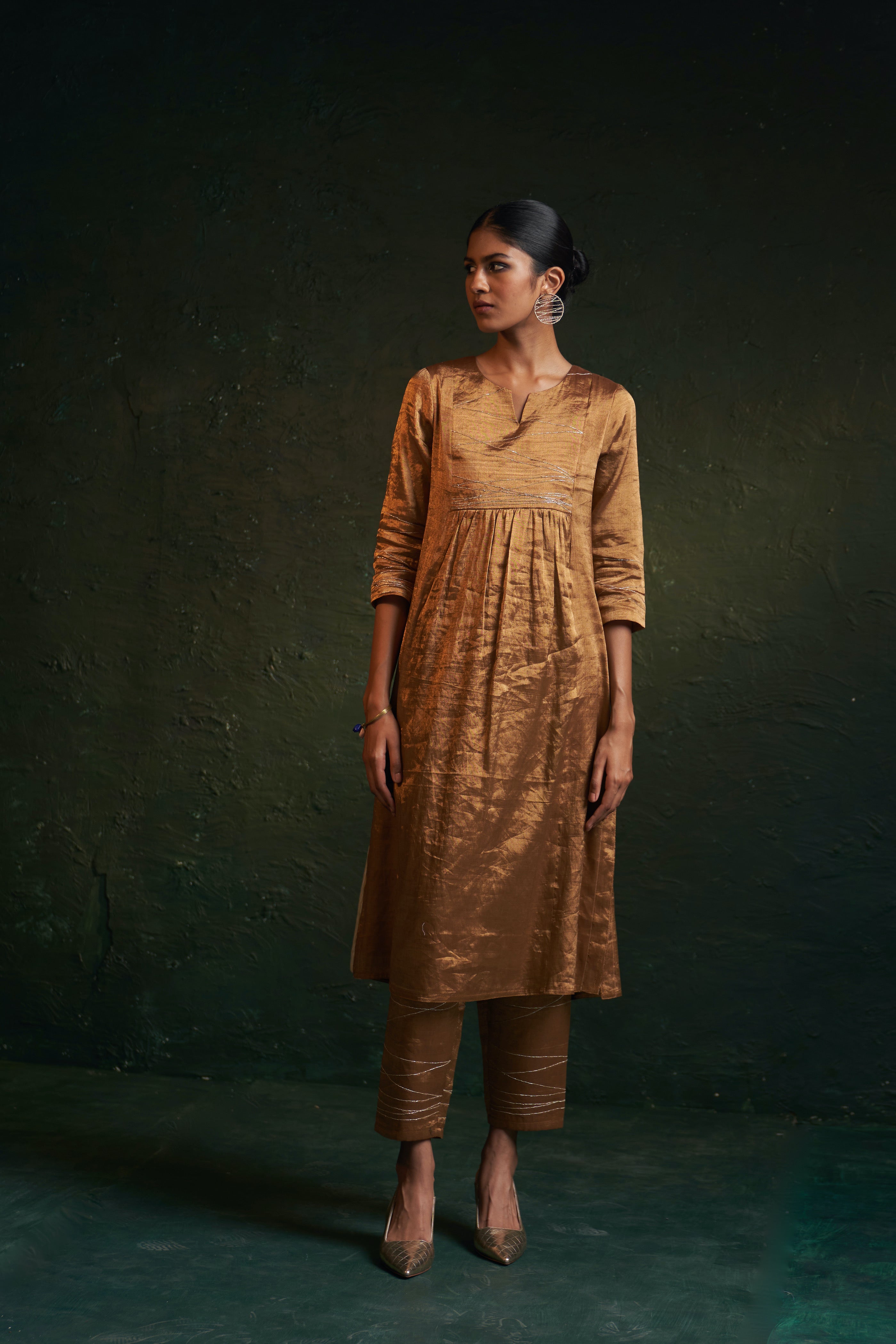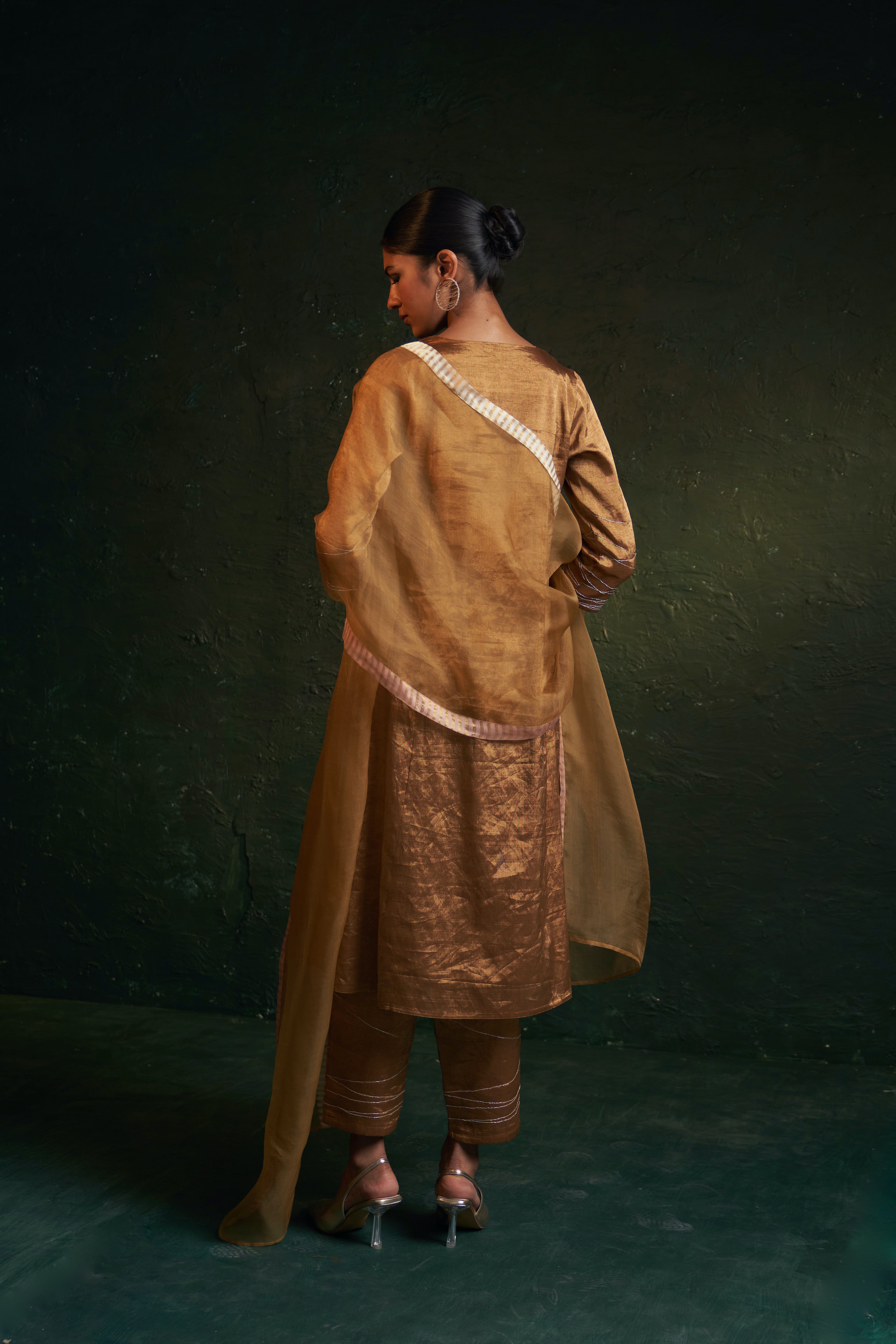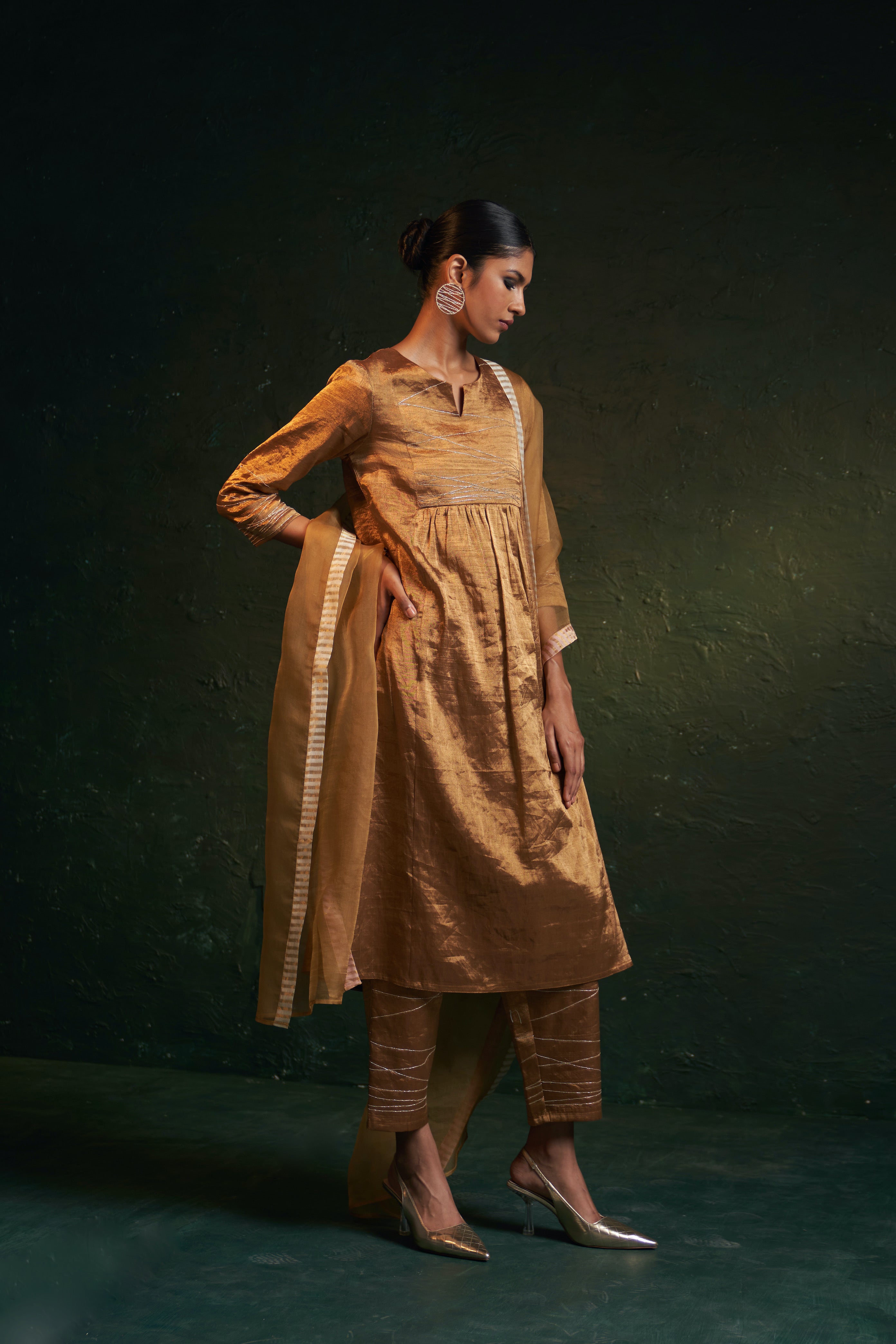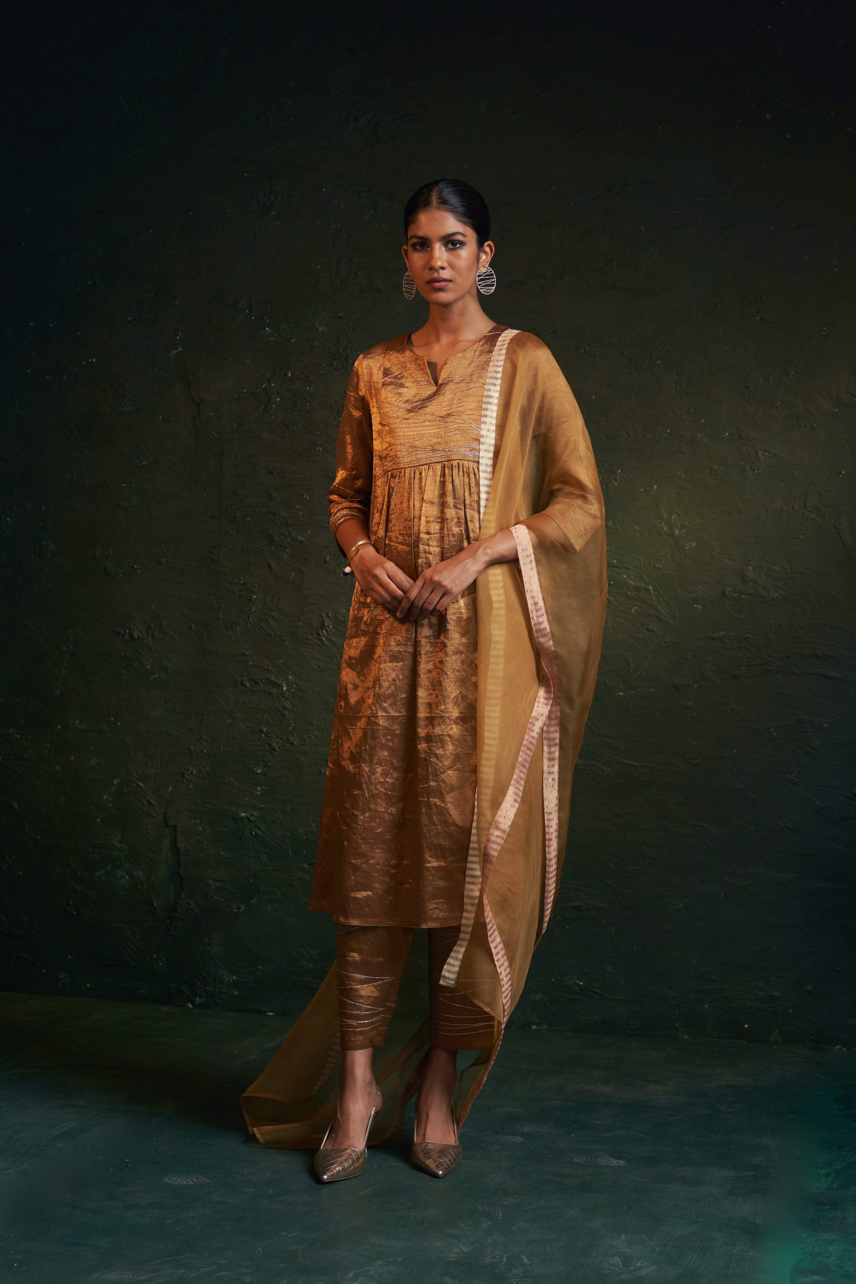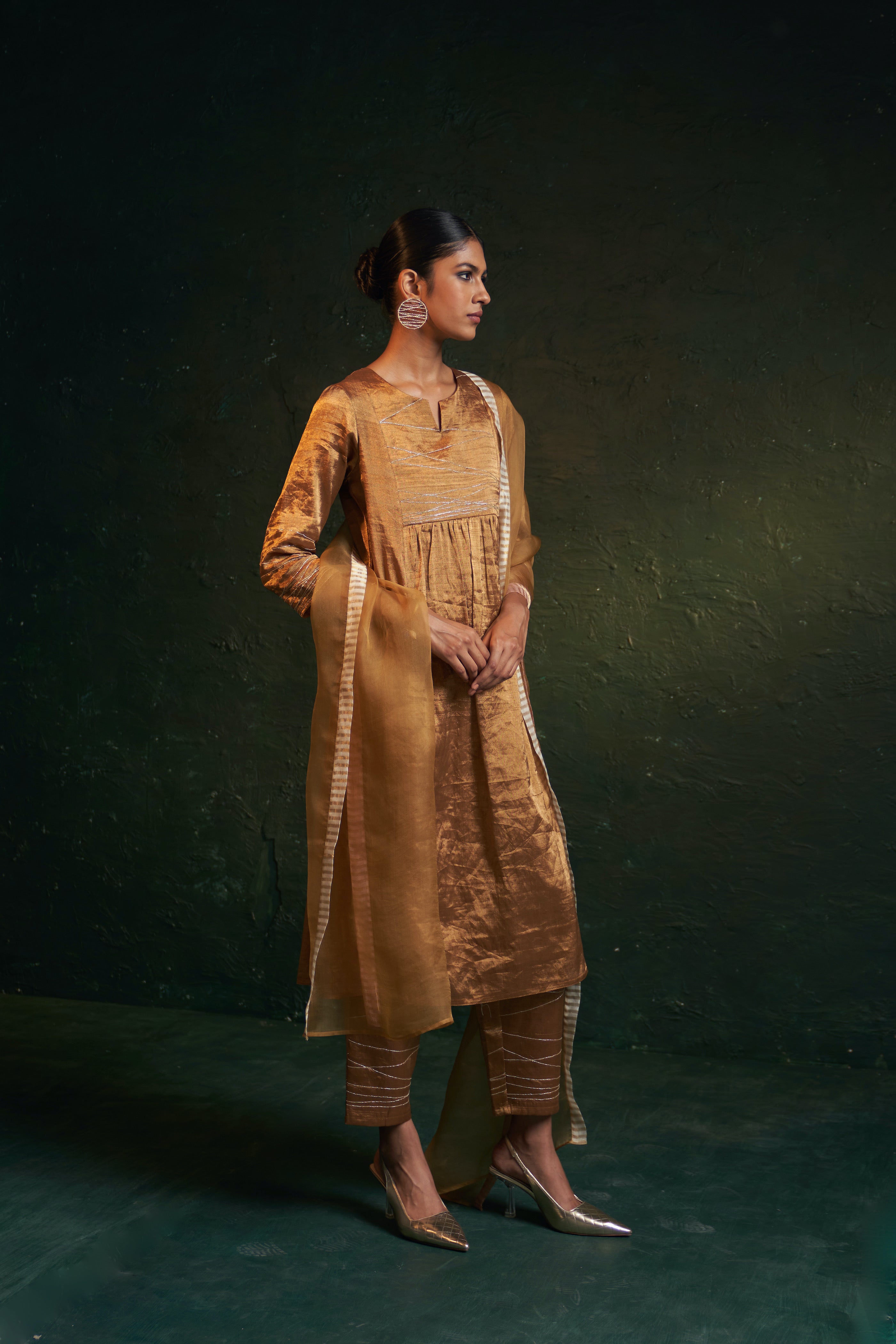 Audaciously shine with this Midas Gold Tissue Kurta Set, crafted from a shimmering gold hue tissue fabric and subtle dori embroidery adds to its elegance. With a graceful gathered kurta, unique dori embroidered pants, and a delicate organza dupatta, this sophisticated ensemble is perfect for a night of luxurious festivities.