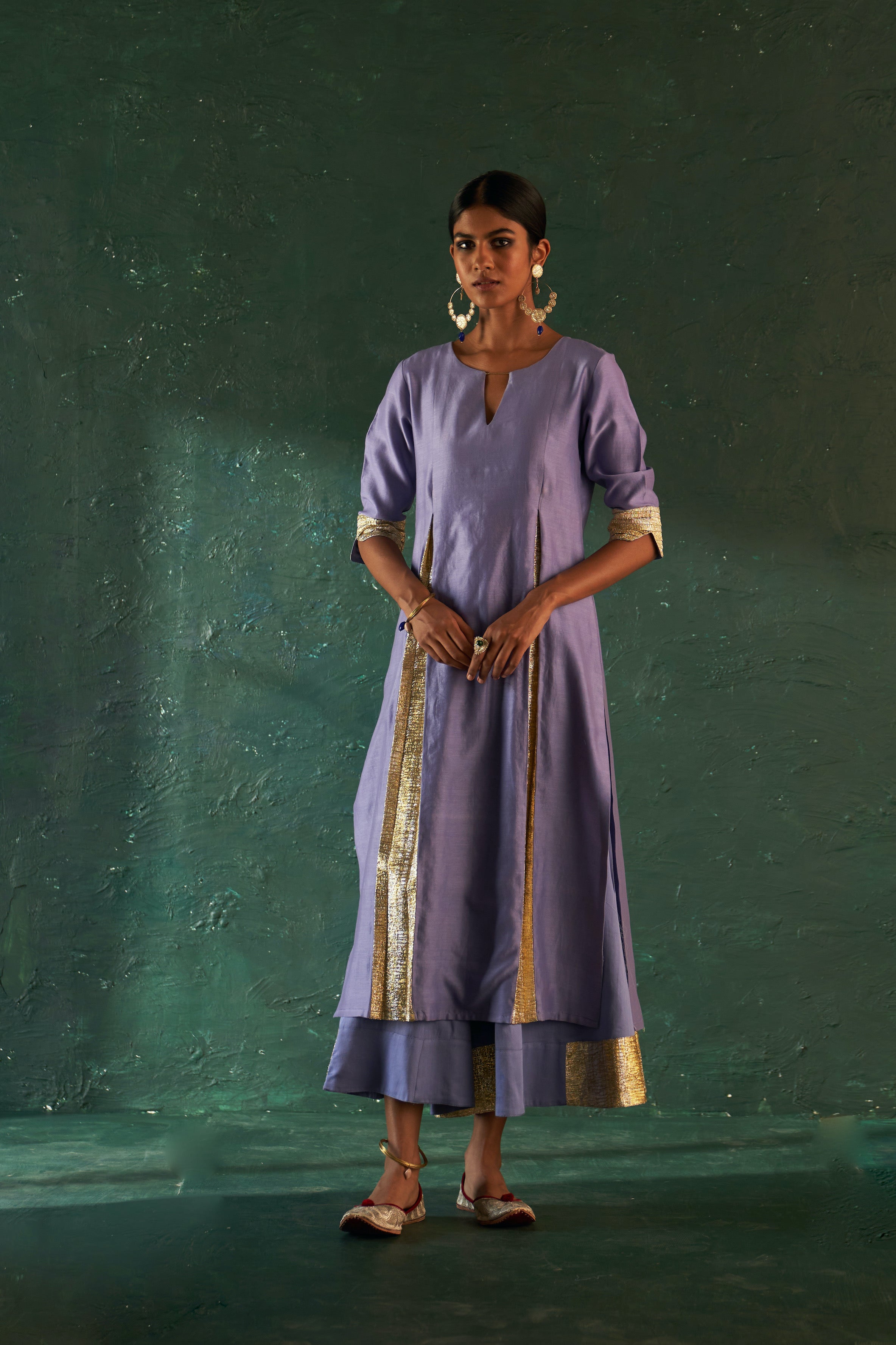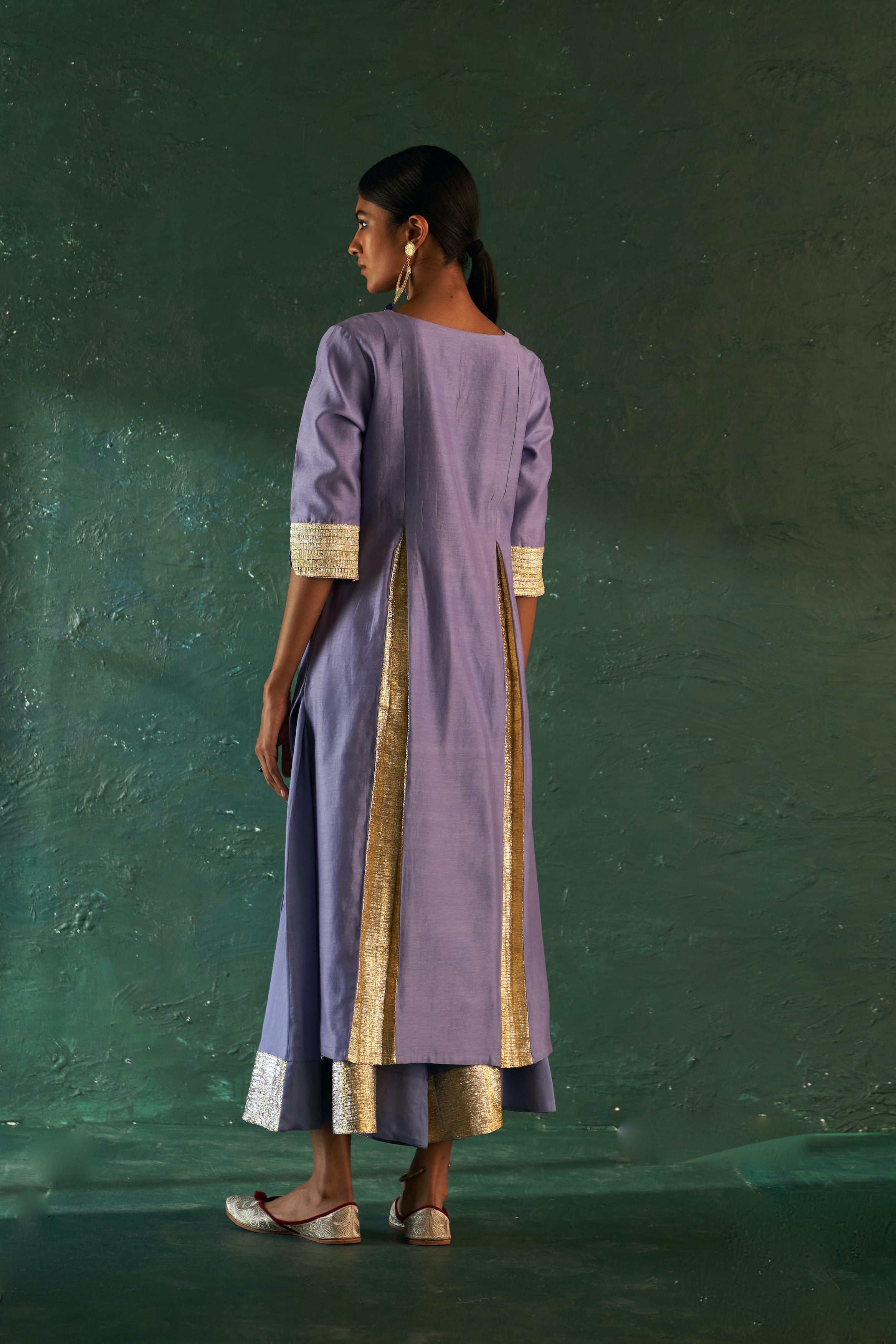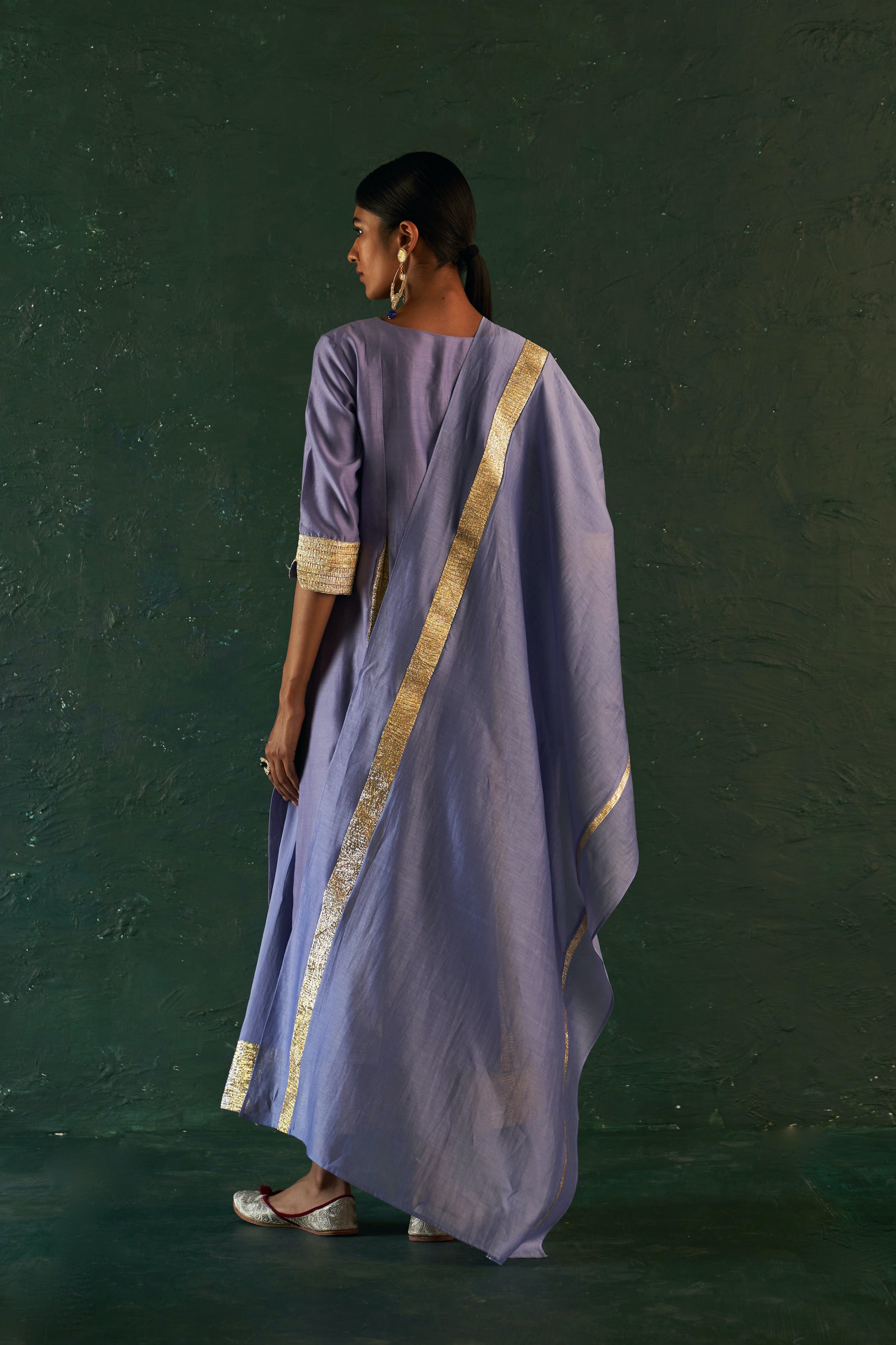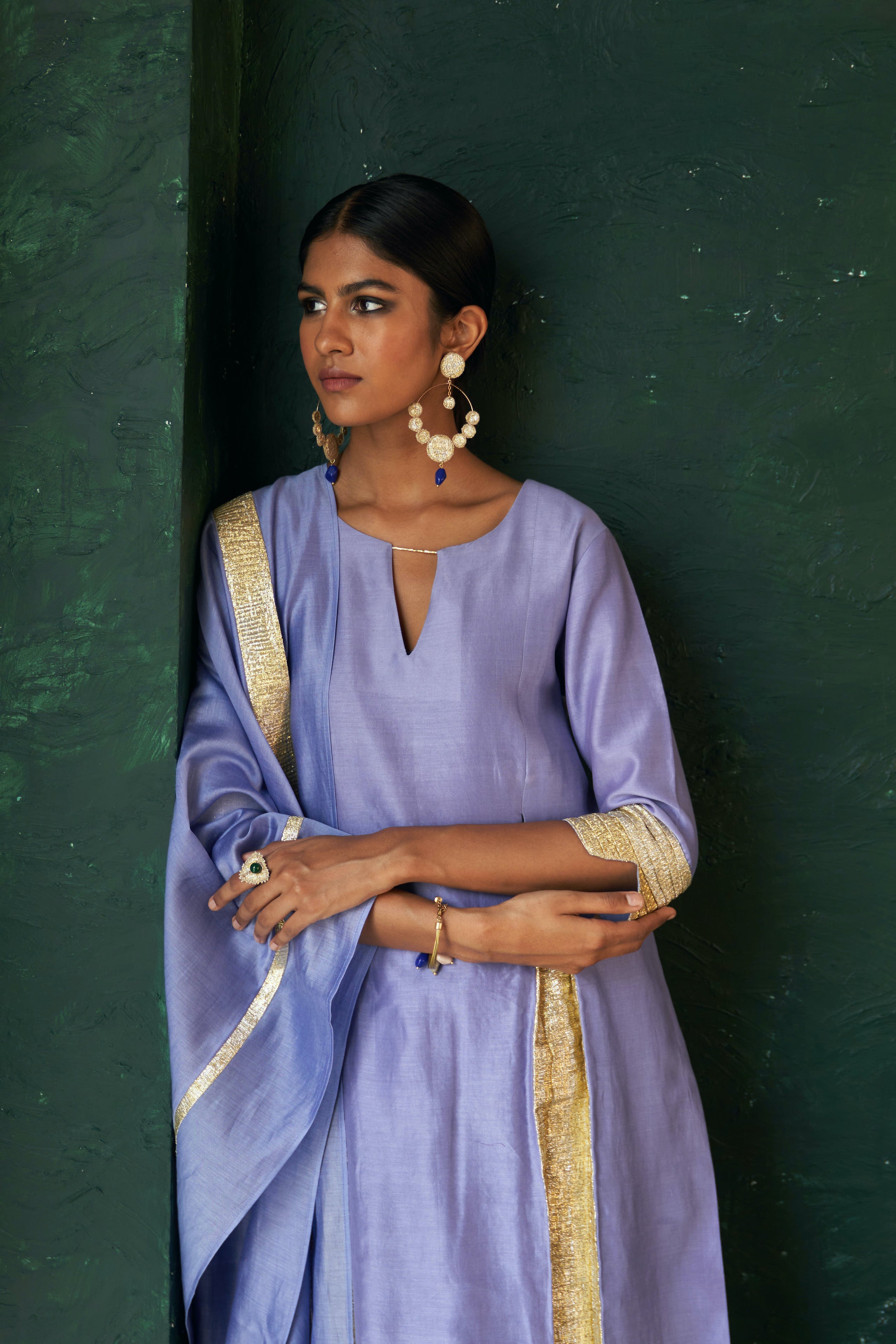 A chanderi kurta set in decadent lavender colour embellished with beautiful crinkled gota in front and back. Paired with gota embellished pants and dupatta, this designer ensemble is ideal for your festive celebrations.