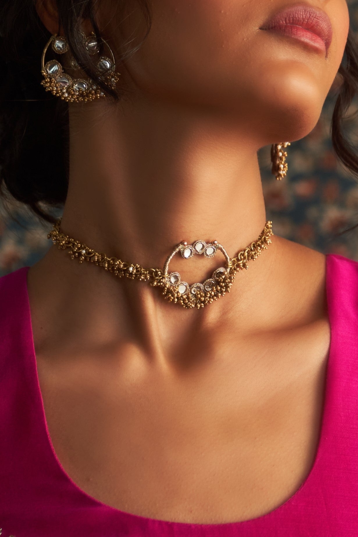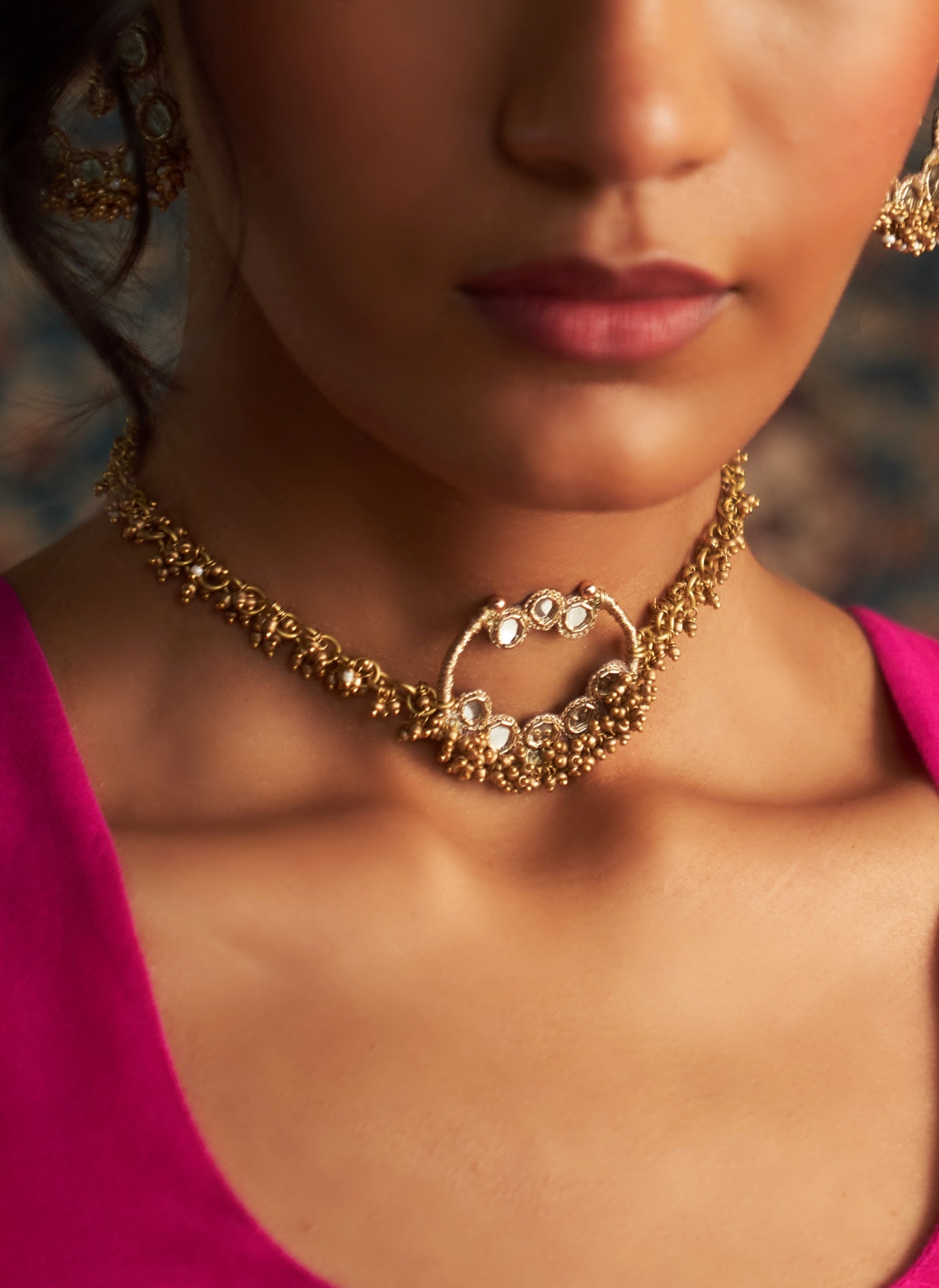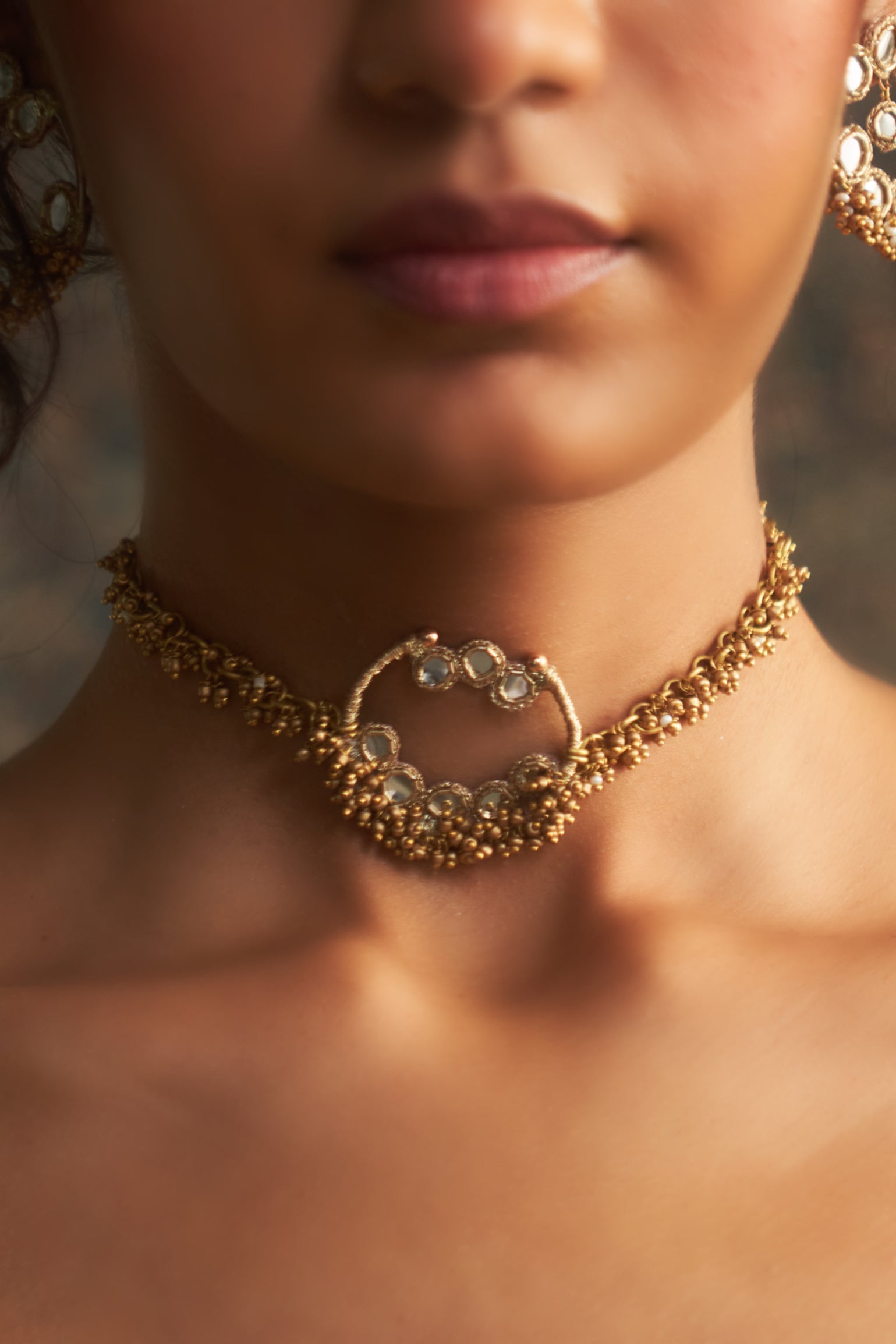Make a bold statement with our Handcrafted Mirror and Beads Gold-Toned Choker, a stunning blend of tradition and contemporary elegance. Featuring a delicate gold-toned base adorned with intricate mirror work and bead detailing, this handcrafted choker radiates sophistication and charm. Perfect for festive events, weddings, or adding a touch of luxury to your evening wear, this piece is designed to highlight your neckline with grace and allure. Lightweight yet impactful, this choker is a must-have for those who love timeless, handcrafted jewelry.
