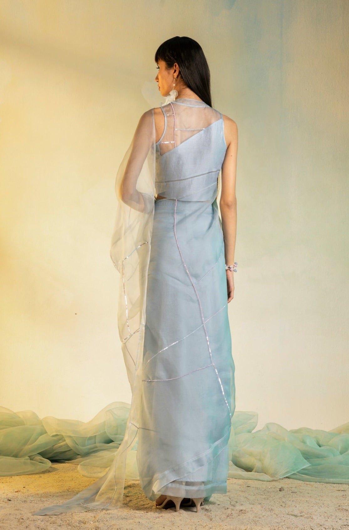 Organza ready to wear stitched saree highlighted with sequin embroidery and narrow pallu. Paired with sleeveless chanderi blouse, hooks closure on front and having organza inlay on back panel. This saree is perfect for any dinner evening out and easy to drape without spending hours.