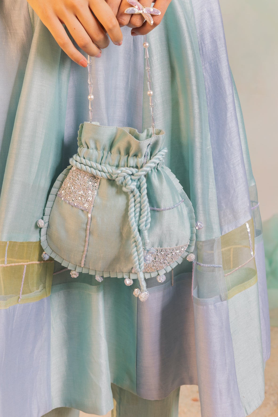 Unique hand embroidered potli with sequin work. Comes with a delicate glass beads string and sequin ball tassels. Carry it as per your mood and occasion with ease to complement our Aasma outfits.