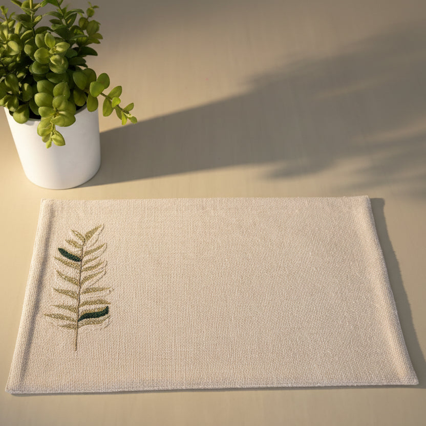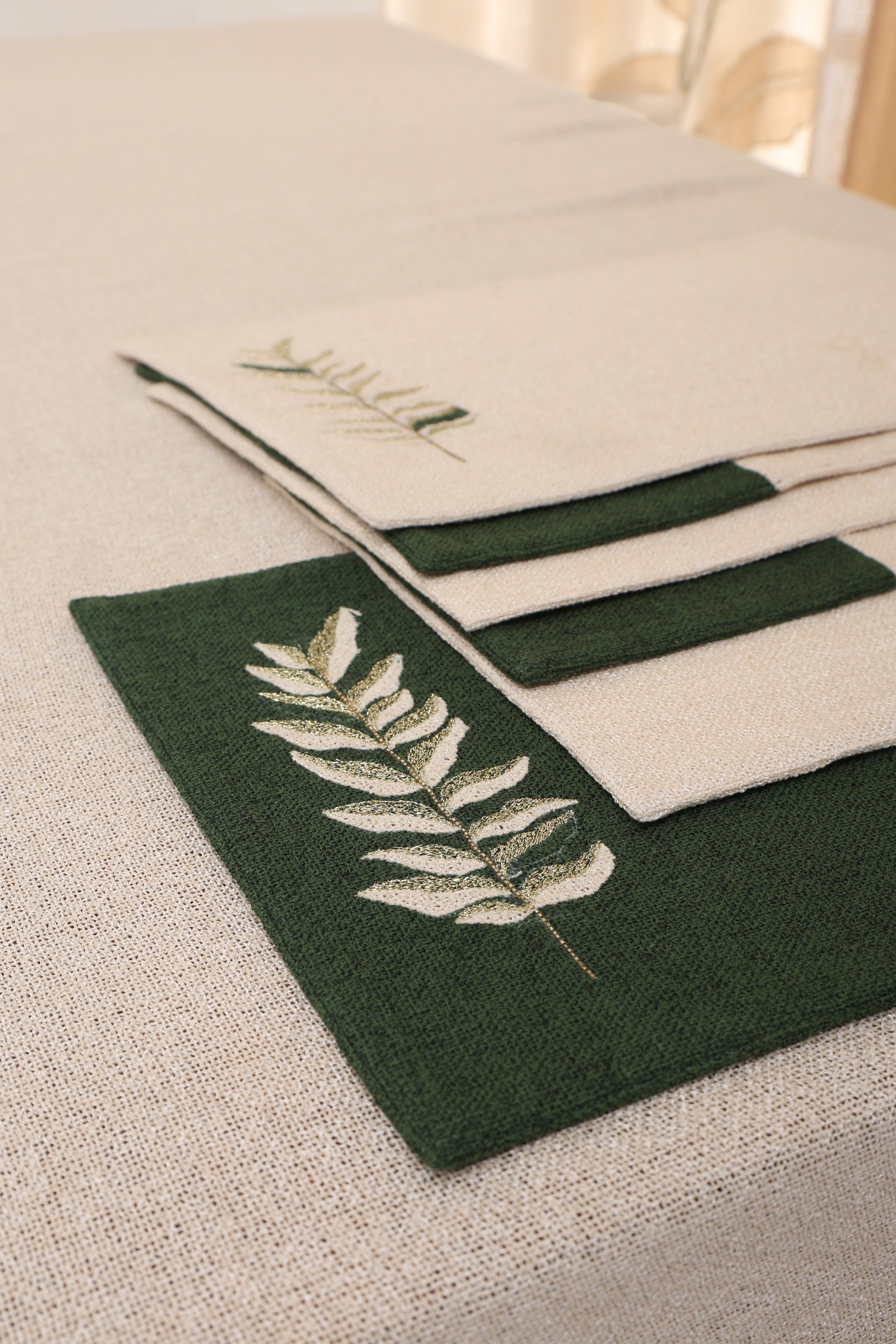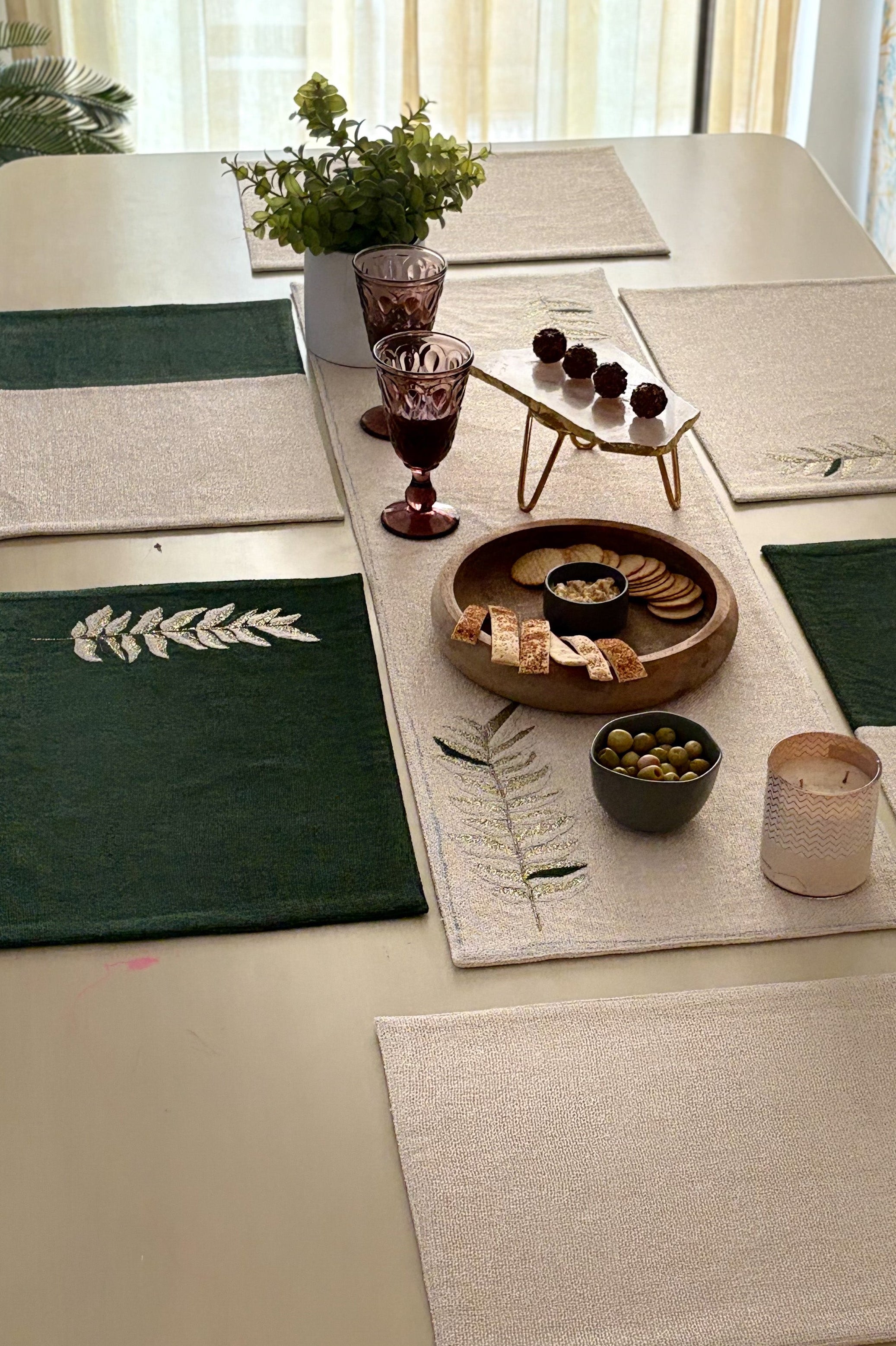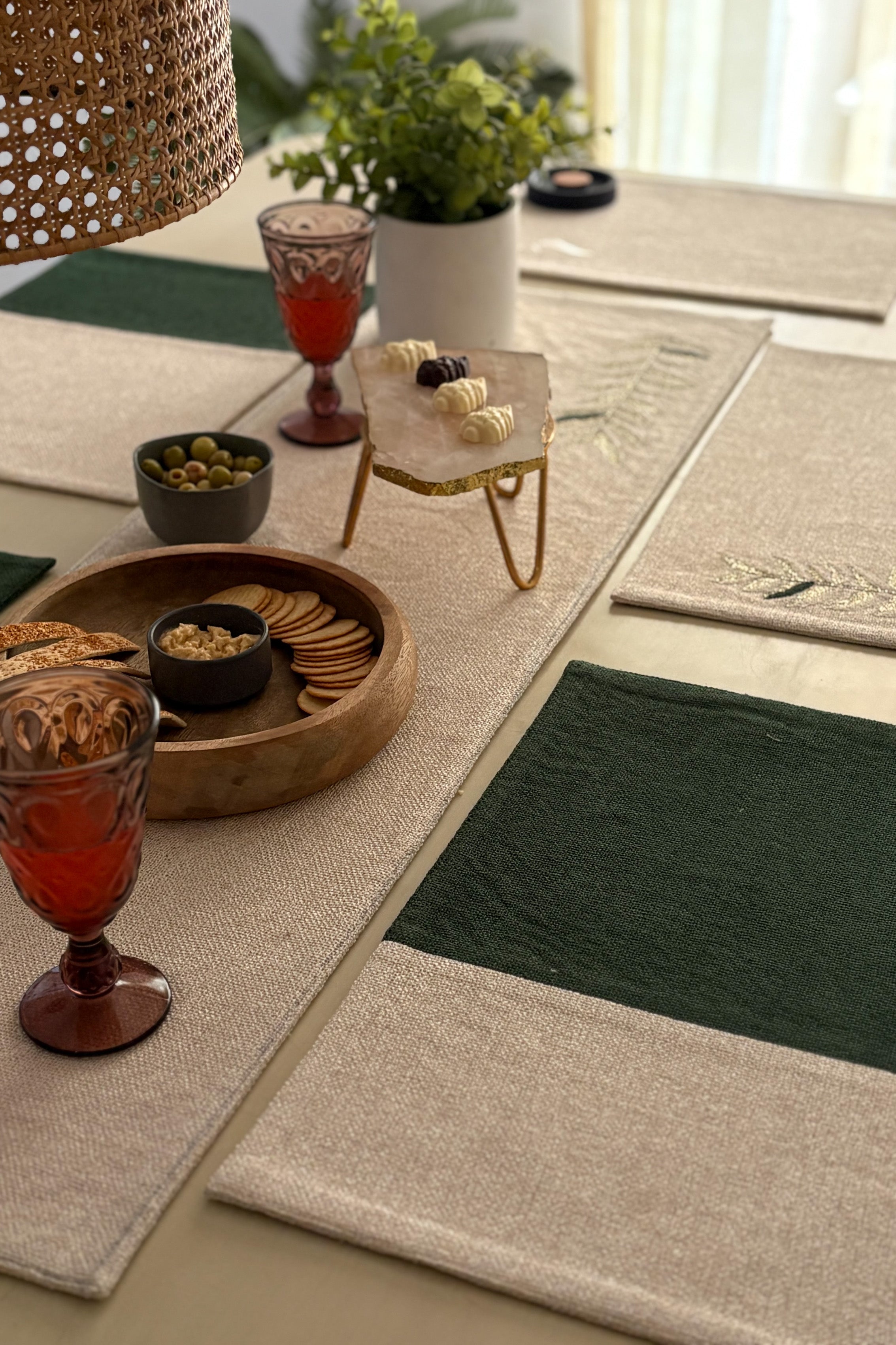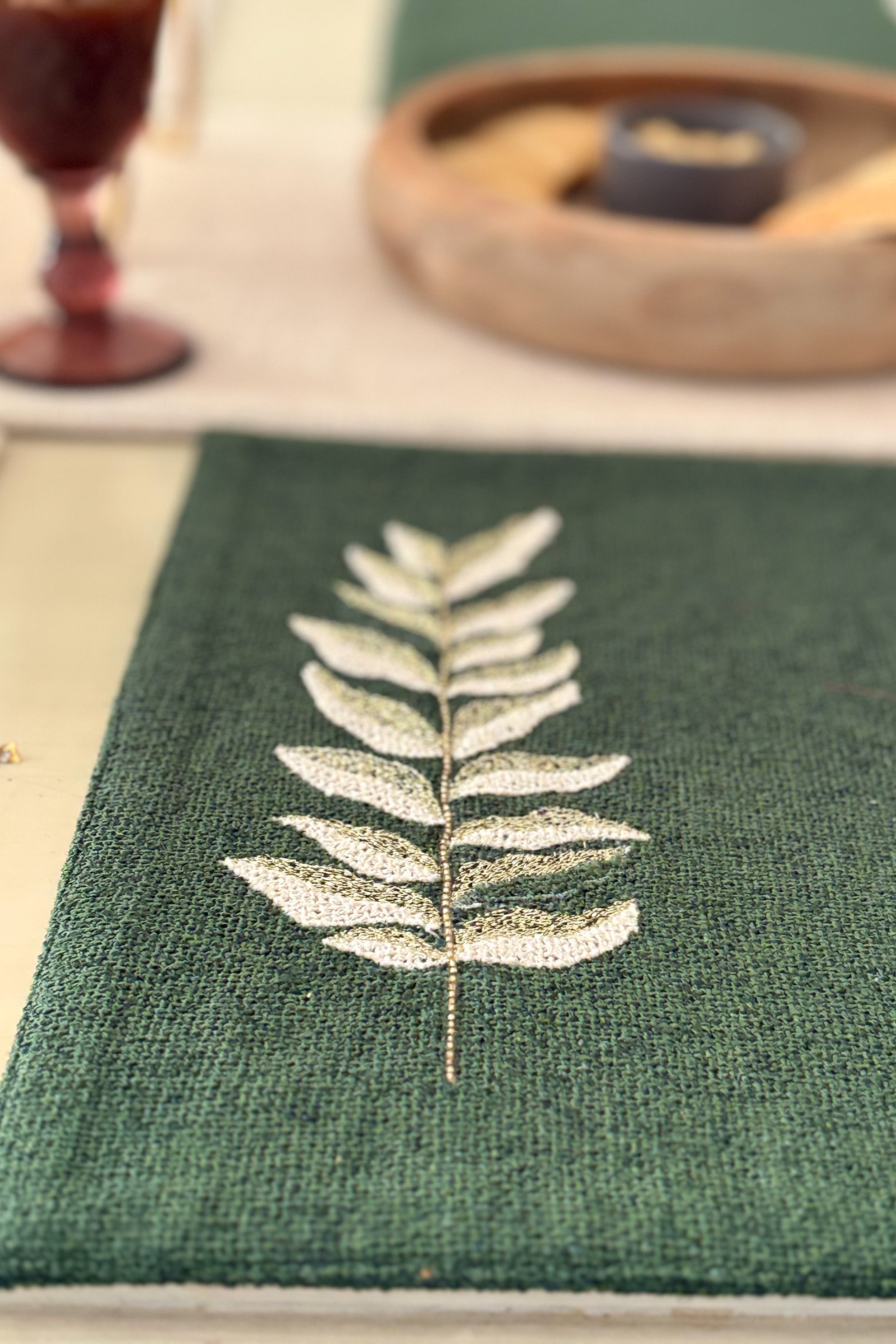 A versatile set of table mats, thoughtfully designed for both casual brunches and formal dinners. This set of premium Jute textured placemats in ivory and forest green colours with a mix of solid colour blocks and elegant leaf gold embroidery are perfect for adding a refined touch to your table.