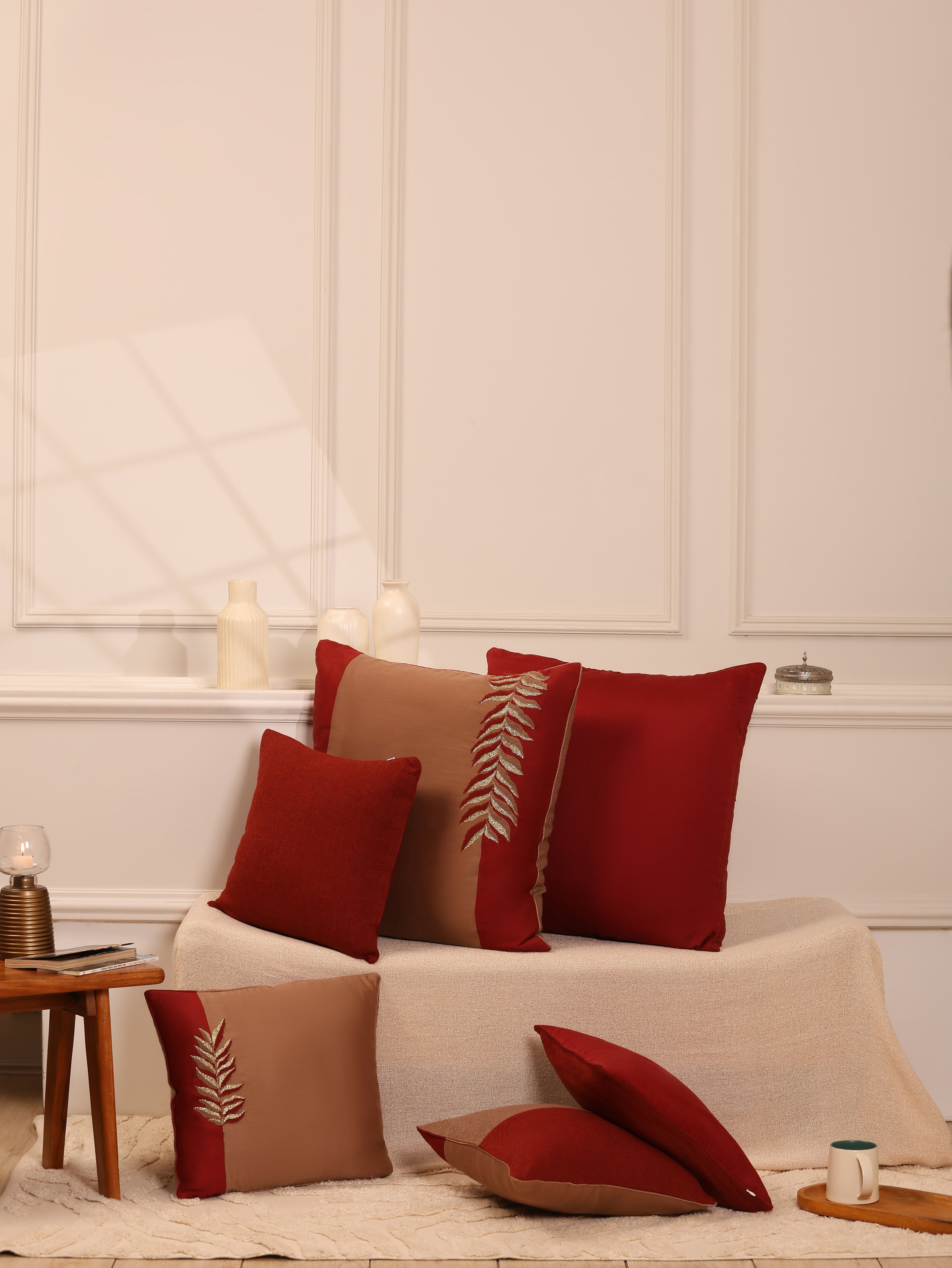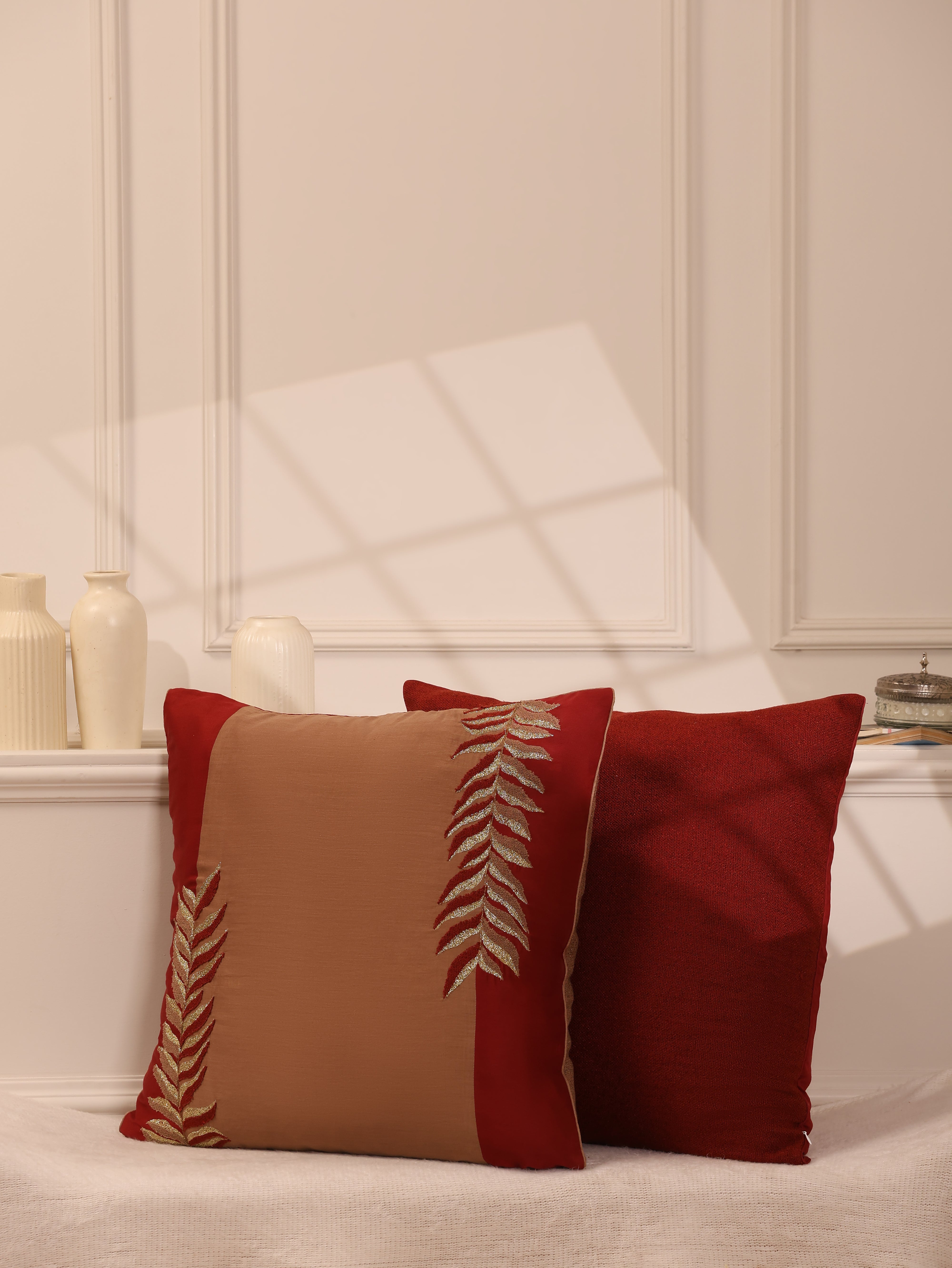 A set of two statement cushions designed to elevate any space. One features intricate leaf-branch embroidery, while the other comes in a solid hue with an elegant interplay of fabrics on both sides. Style them together as a pair or mix with smaller cushions for a layered, sophisticated look on your couch.