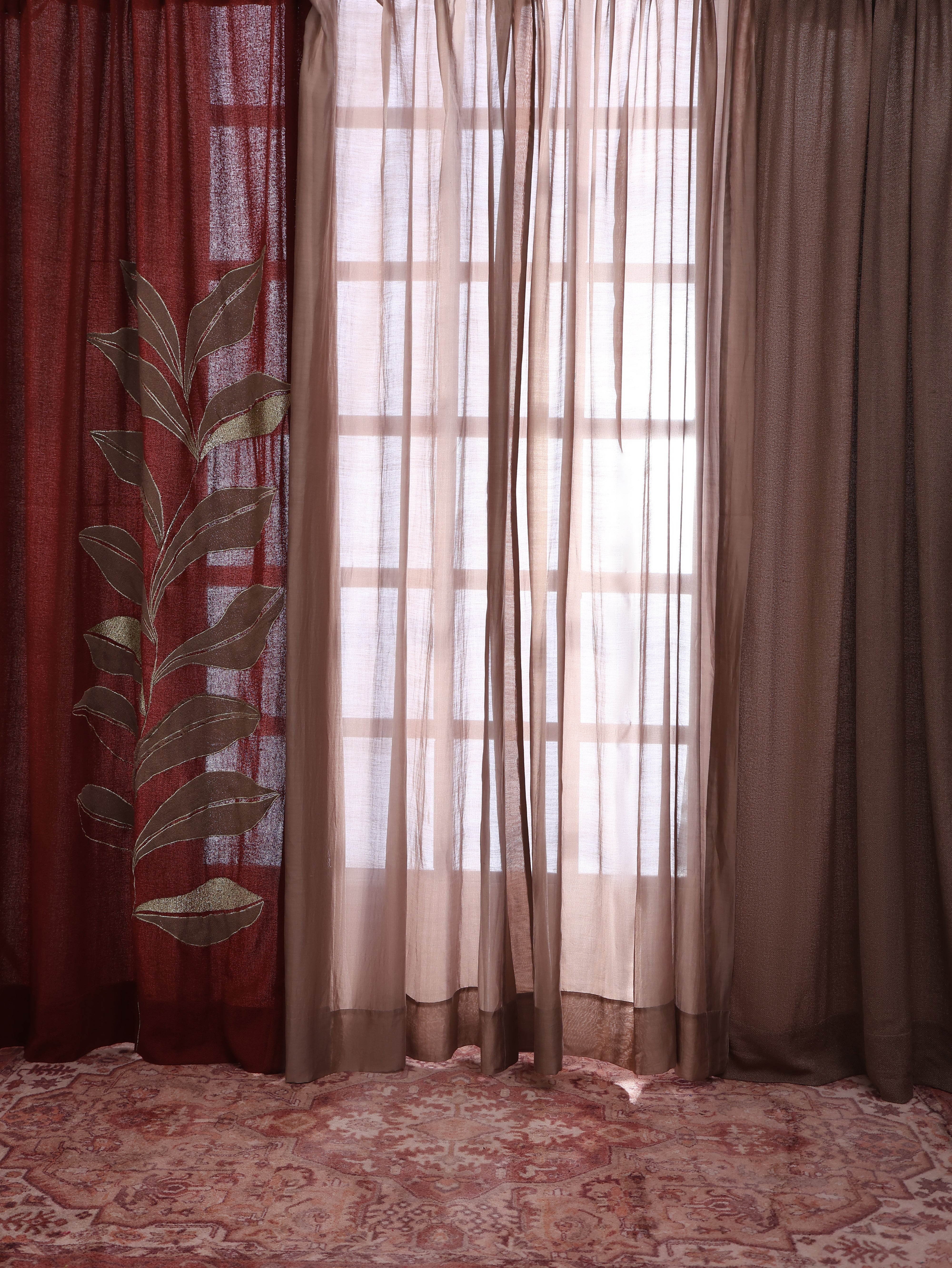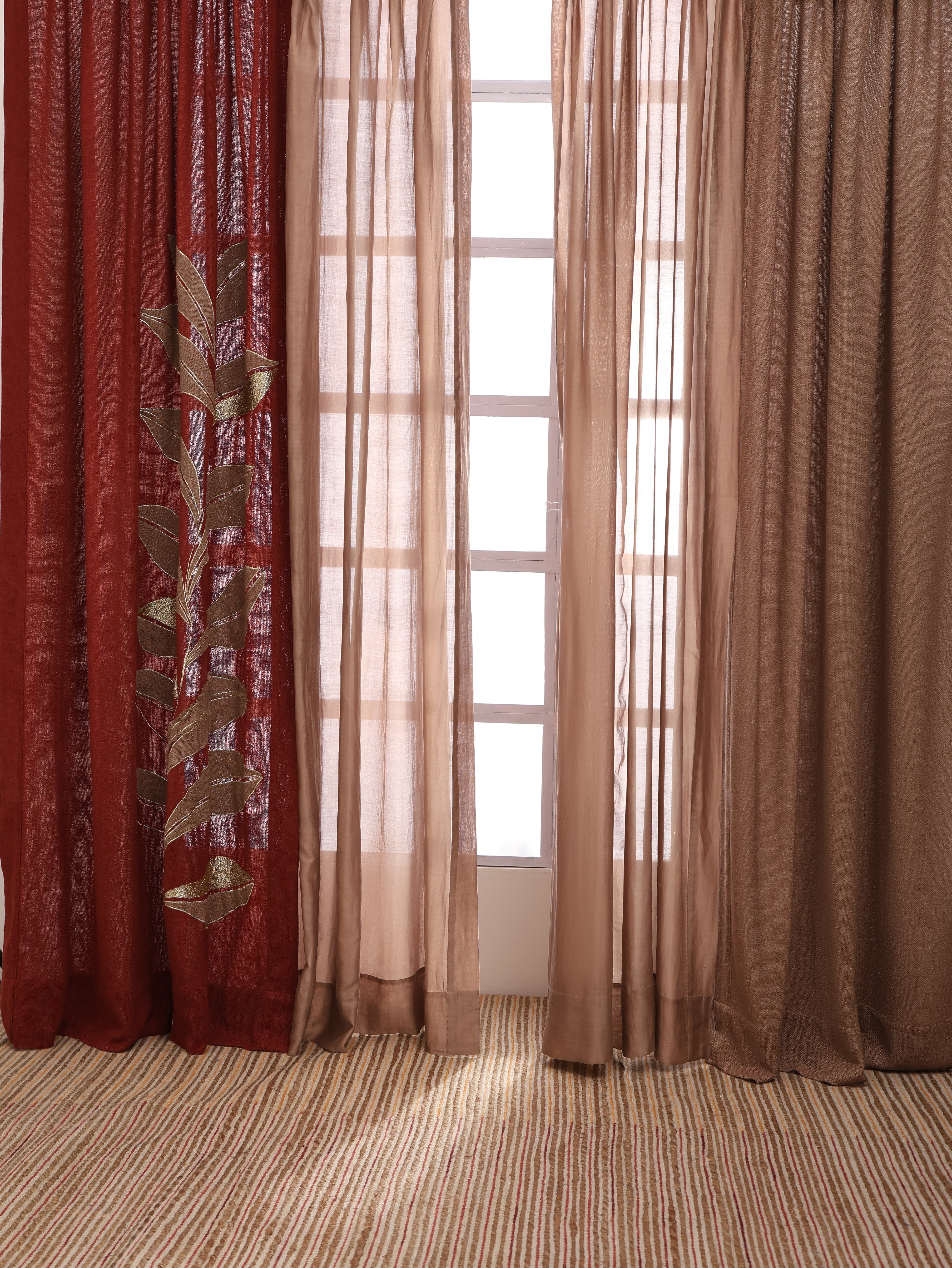 Three curtains come in a warm brown hue, two sheer Chanderi panels and one jute panel offering a cohesive and calming aesthetic. The fourth curtain, in a rich rust shade, stands out with bold leaf embroidery, adding a striking focal point and a touch of artisanal charm to your décor.