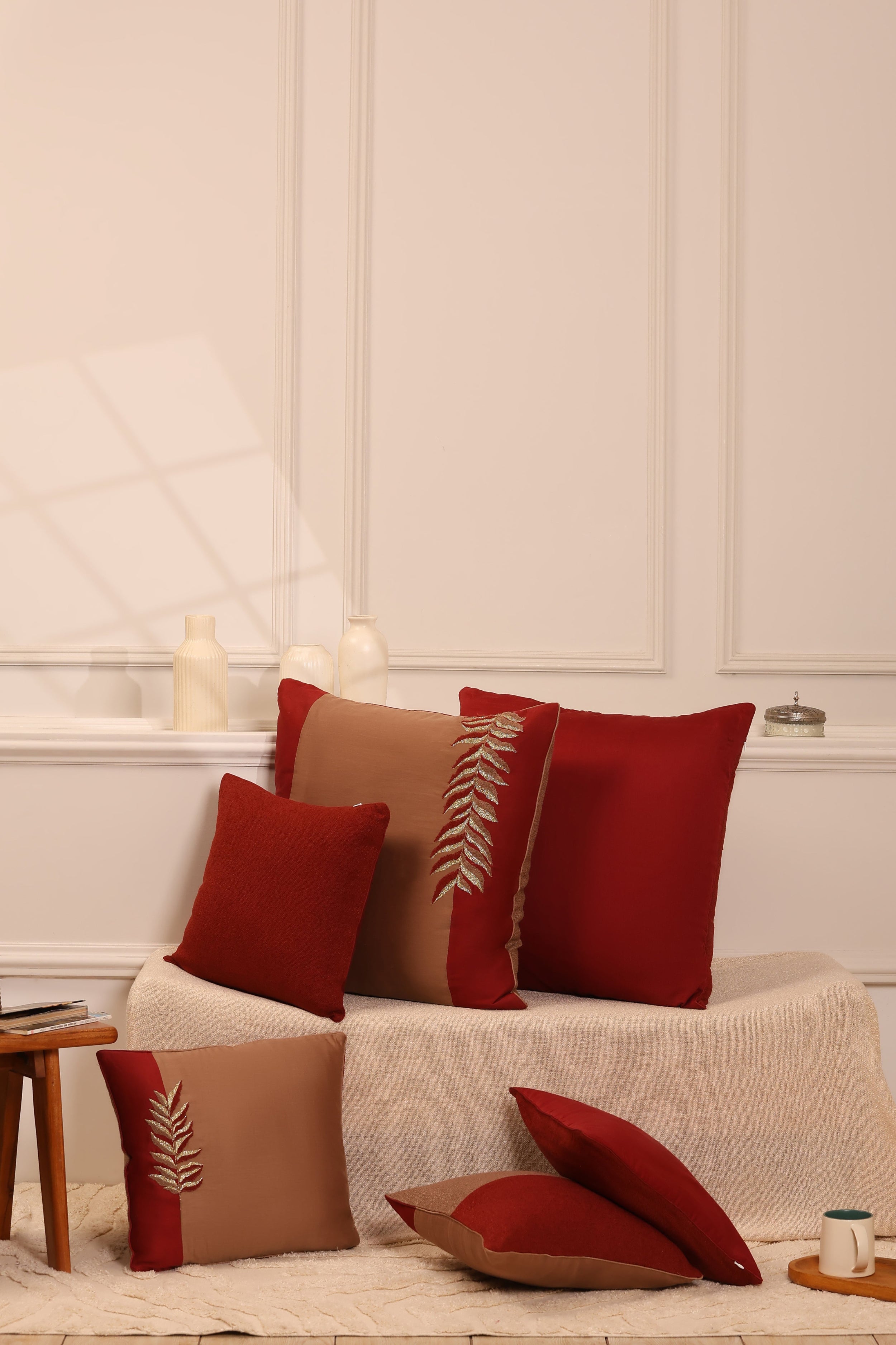 A set of four beautifully coordinated cushions crafted to bring texture and elegance to your space. Two cushions feature delicate embroidery with an interplay of fabrics in half-and-half color blocks on the front and back, while the other two come in solid shades with subtle fabric contrasts on both sides. Finished with a concealed zipper for a seamless look, this set creates a refined mix of pattern, color, and texture perfect for layering on your couch or bed.