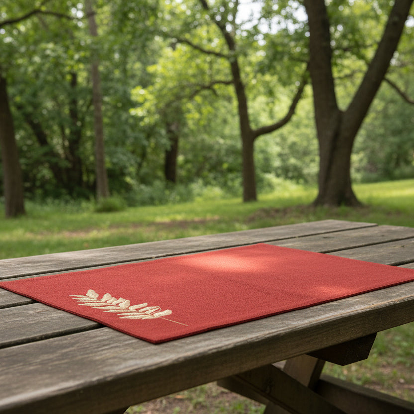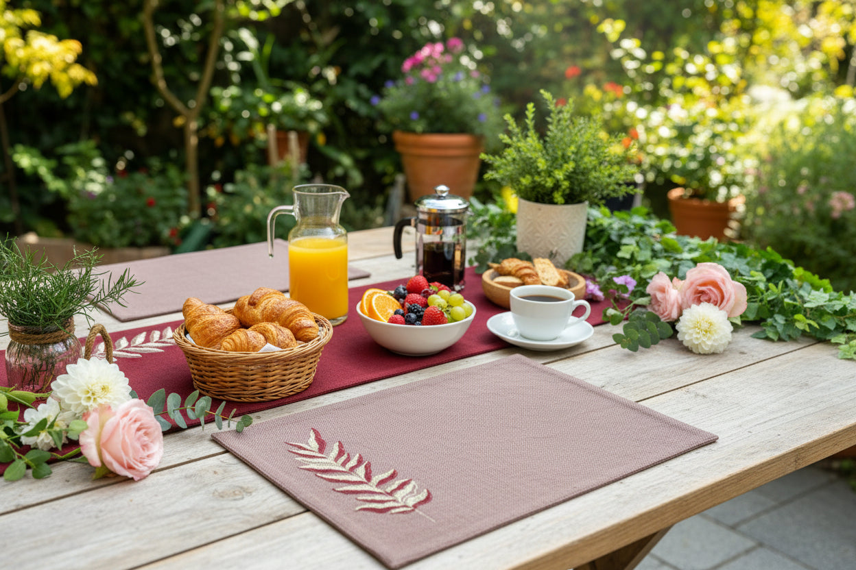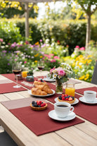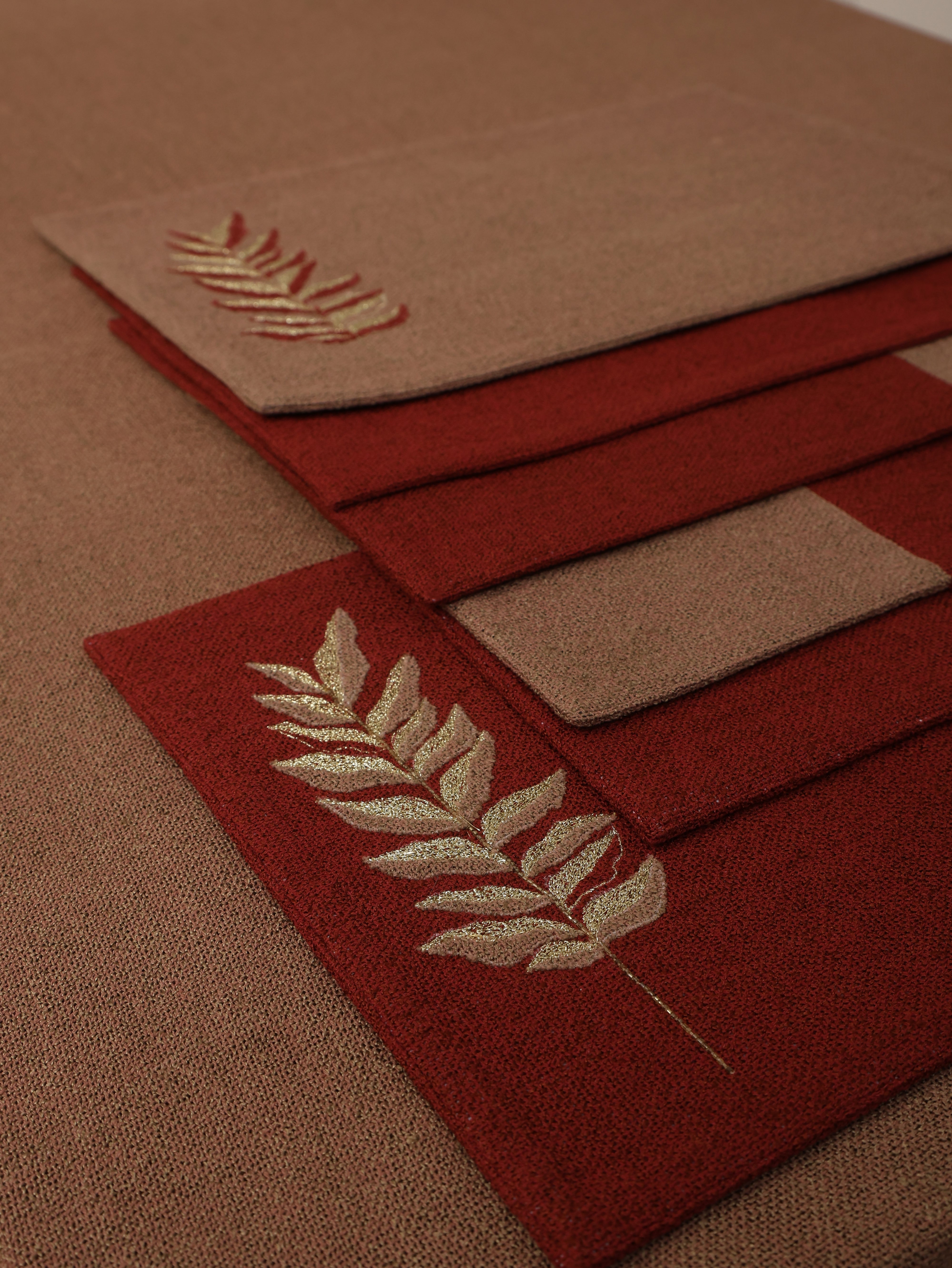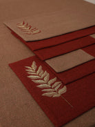 A versatile set of table mats, thoughtfully designed for both casual brunches and formal dinners. This set of premium Jute textured placemats in Rust and Brown colours with a mix of solid color blocks, dual tone and elegant leaf gold embroidery are perfect for adding a refined touch to your table.
