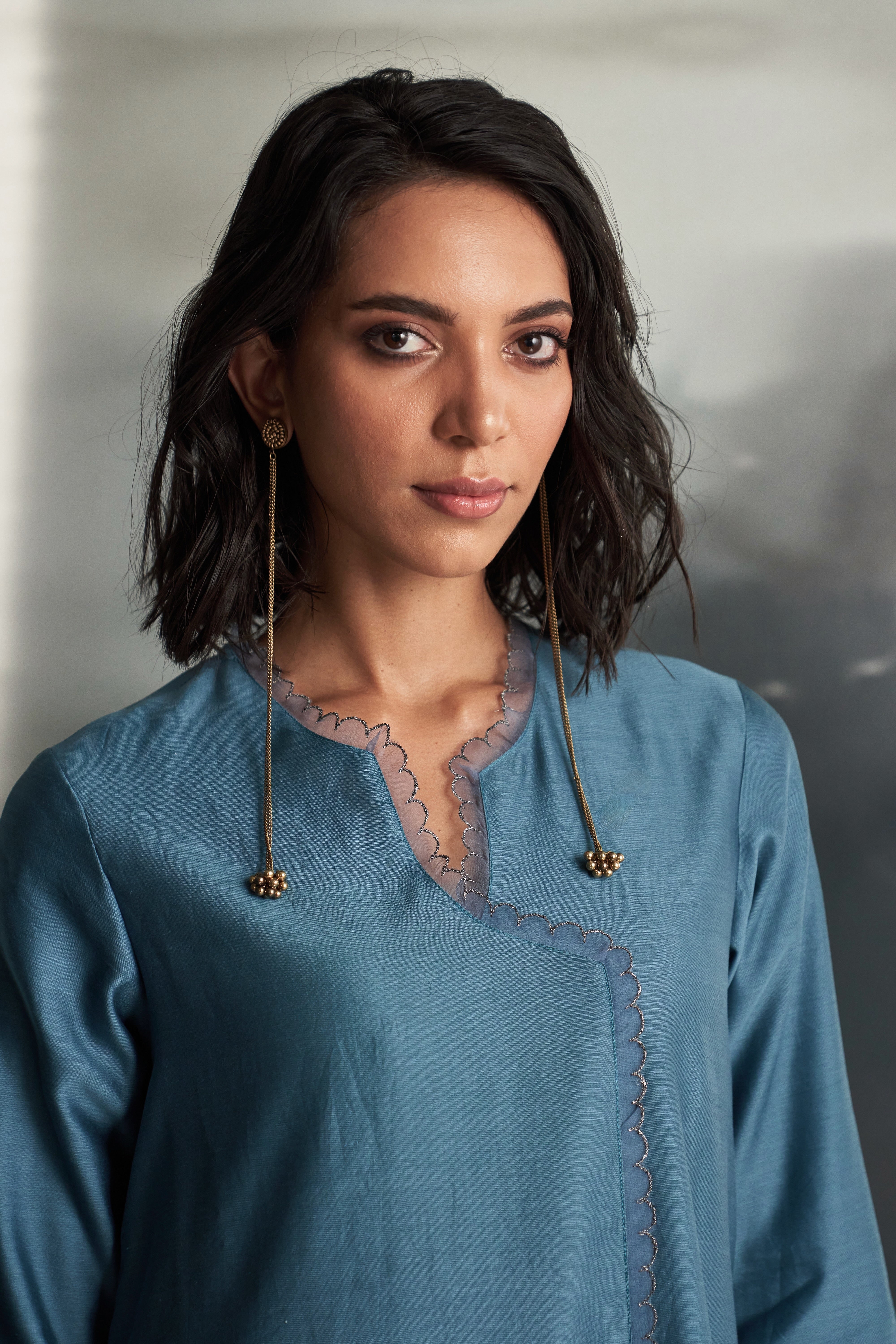 The standout Blue Steel hue, this Chanderi asymmetrical kurta set features feather-touch pure organza patchwork adorned with intricate golden nakshi hand embroidery and a delicate scalloped border throughout.