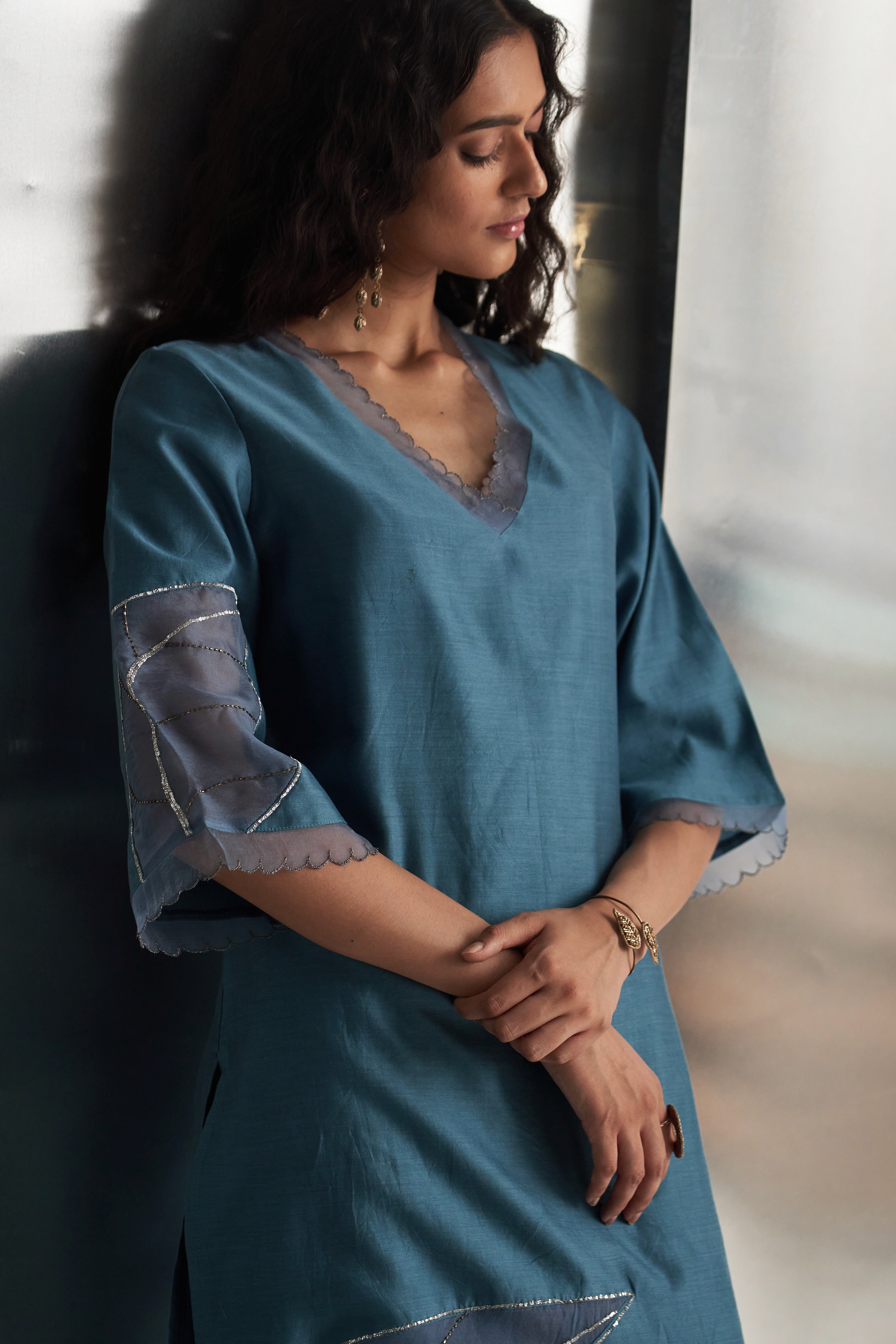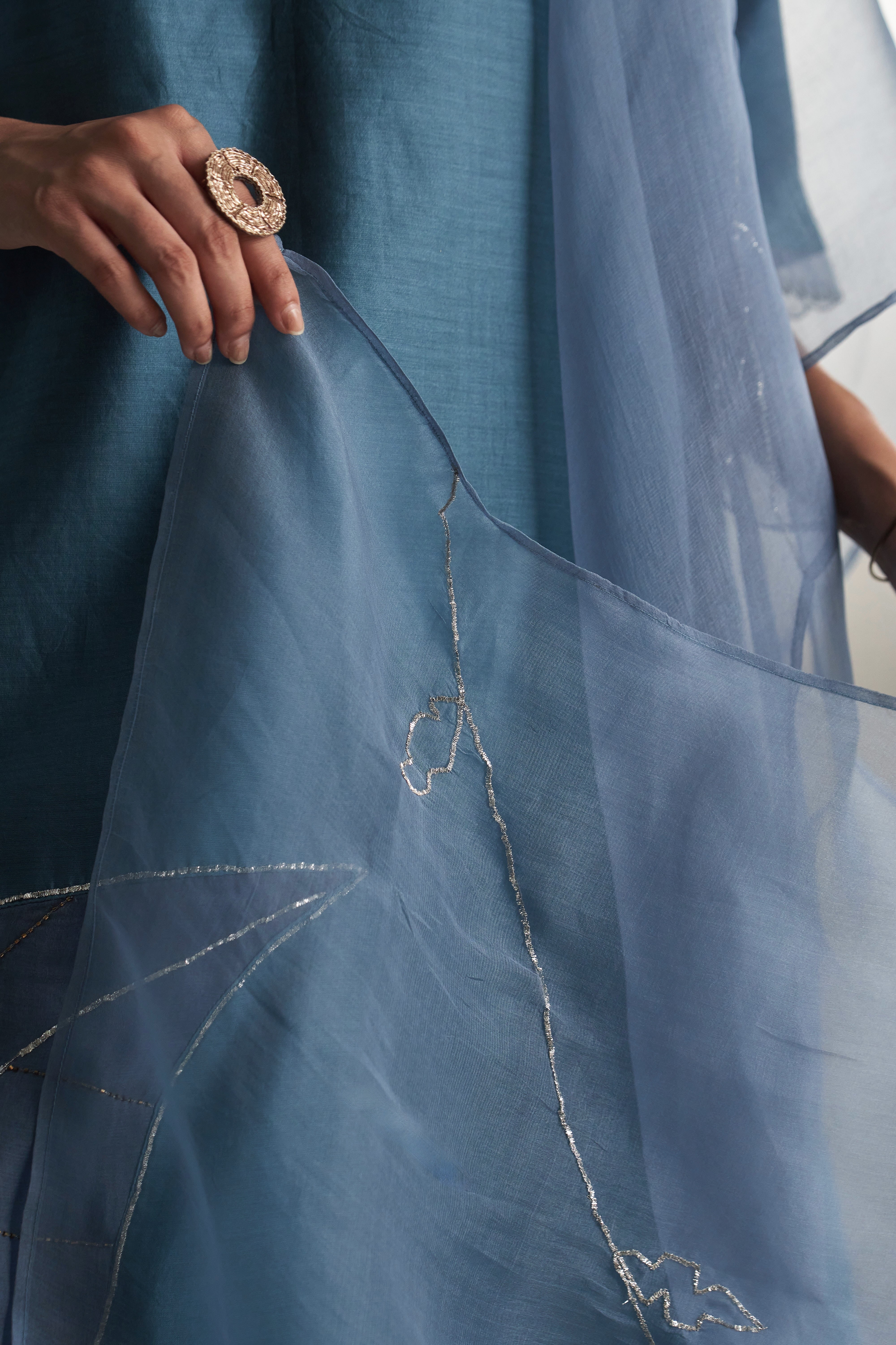 This enchanting kurta set, in a stunning blue steel hue, features a straight silhouette with side slits and a beautifully scalloped neckline. The intricate nakshi and zari hand embroidery gleams against the hue, making this contemporary ensemble perfect for festive celebrations.