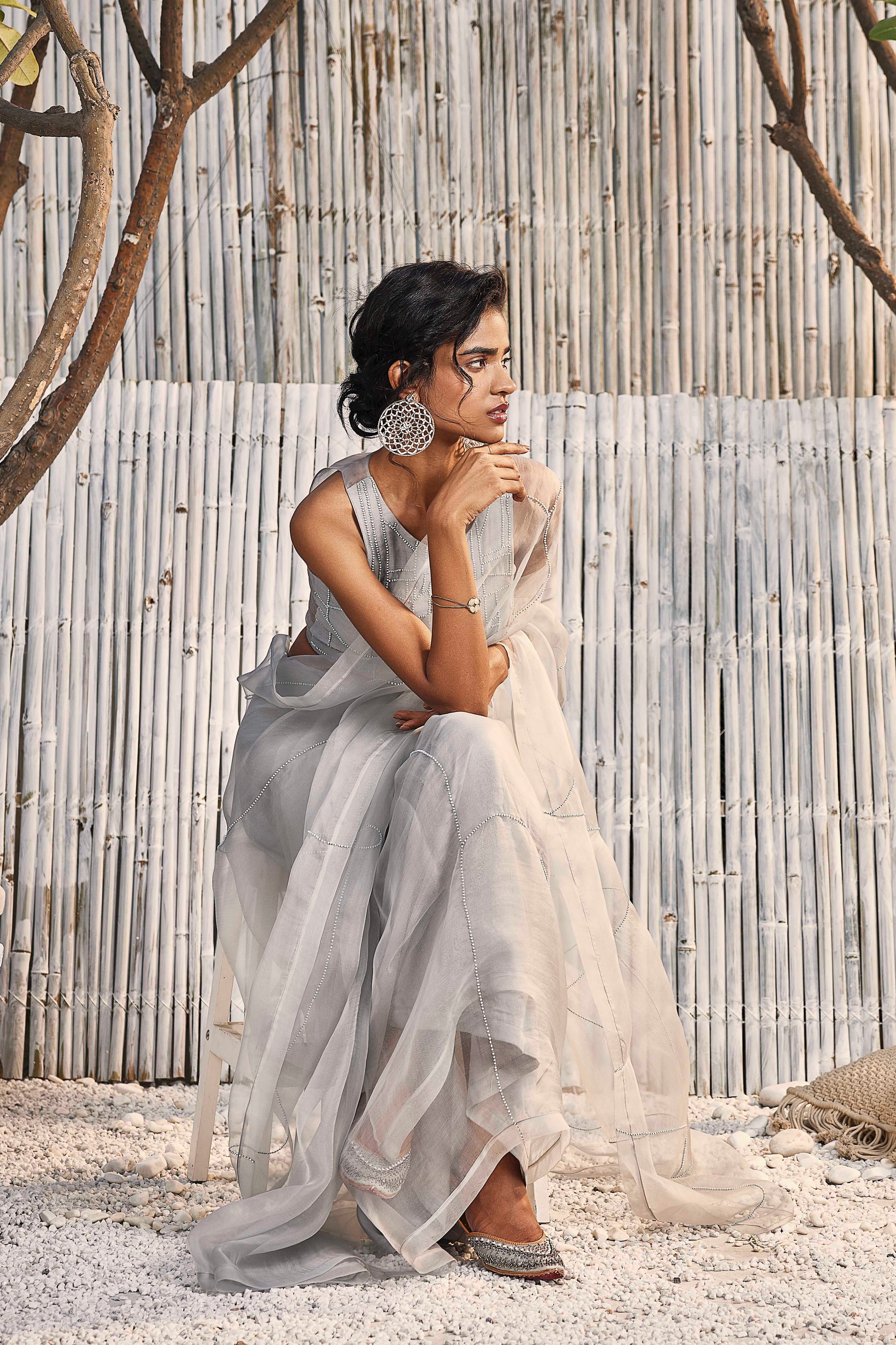 This chic steel grey organza saree with delicate beads hand embroidery all over portrays richness, Shell tassels at the edges adds to the pretty charm. Teamed with perfectly cut chanderi jewel neck blouse intricately designed and detailed with beads hand embroidery on front and sheer organza back adds to the glam quotient.