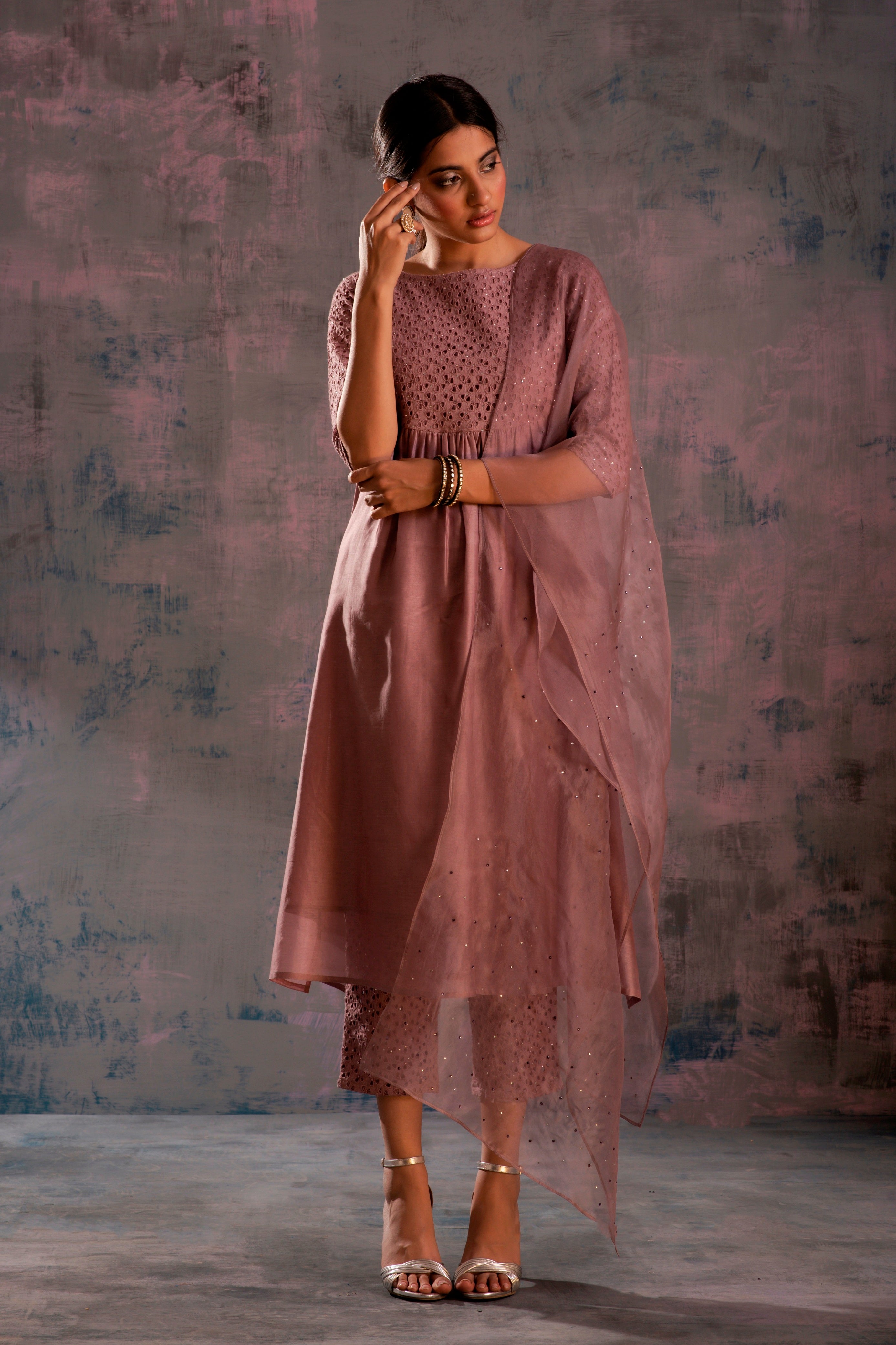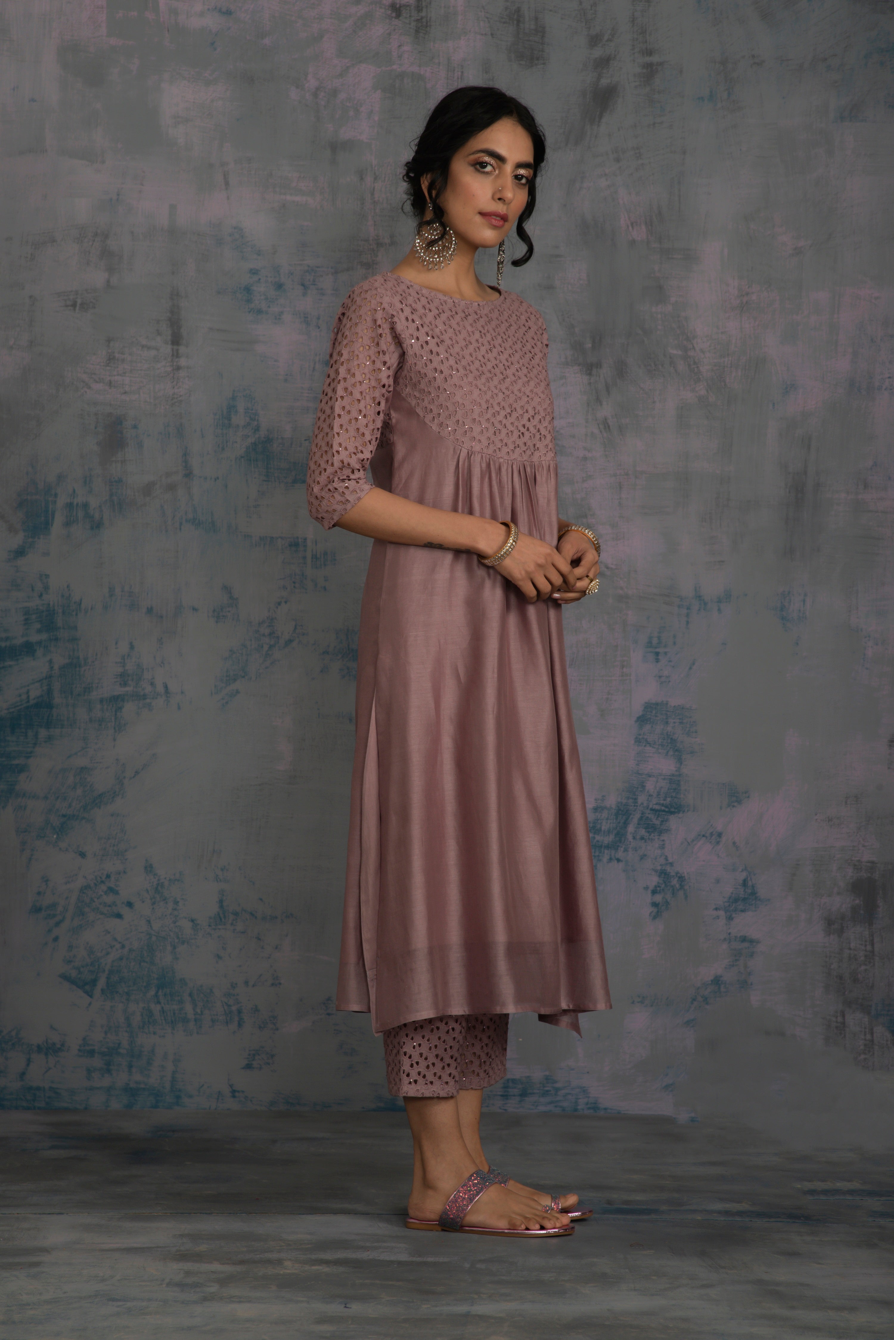 Chanderi berry mauve kurta with cutwork on yoke & sleeve  studded with swarovski. This round yoke kurta is paired with straight cutwork pants studded with swarovski and organza dupatta embellished with swarovski.