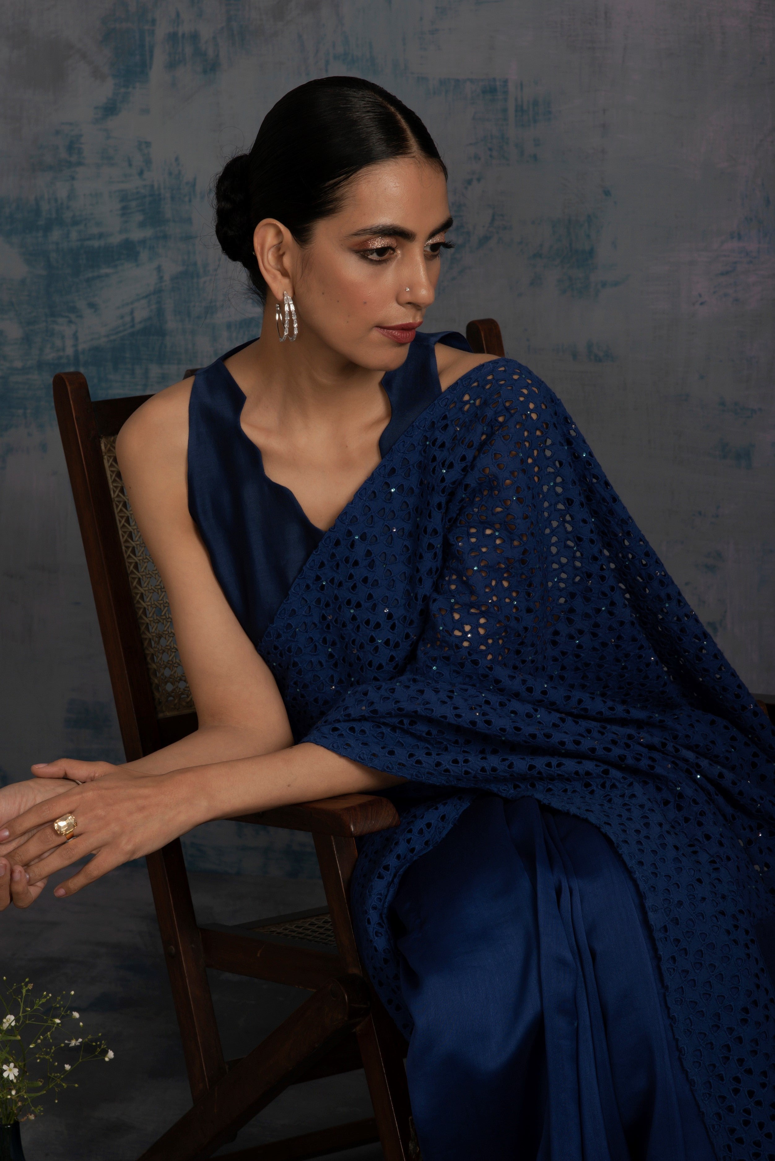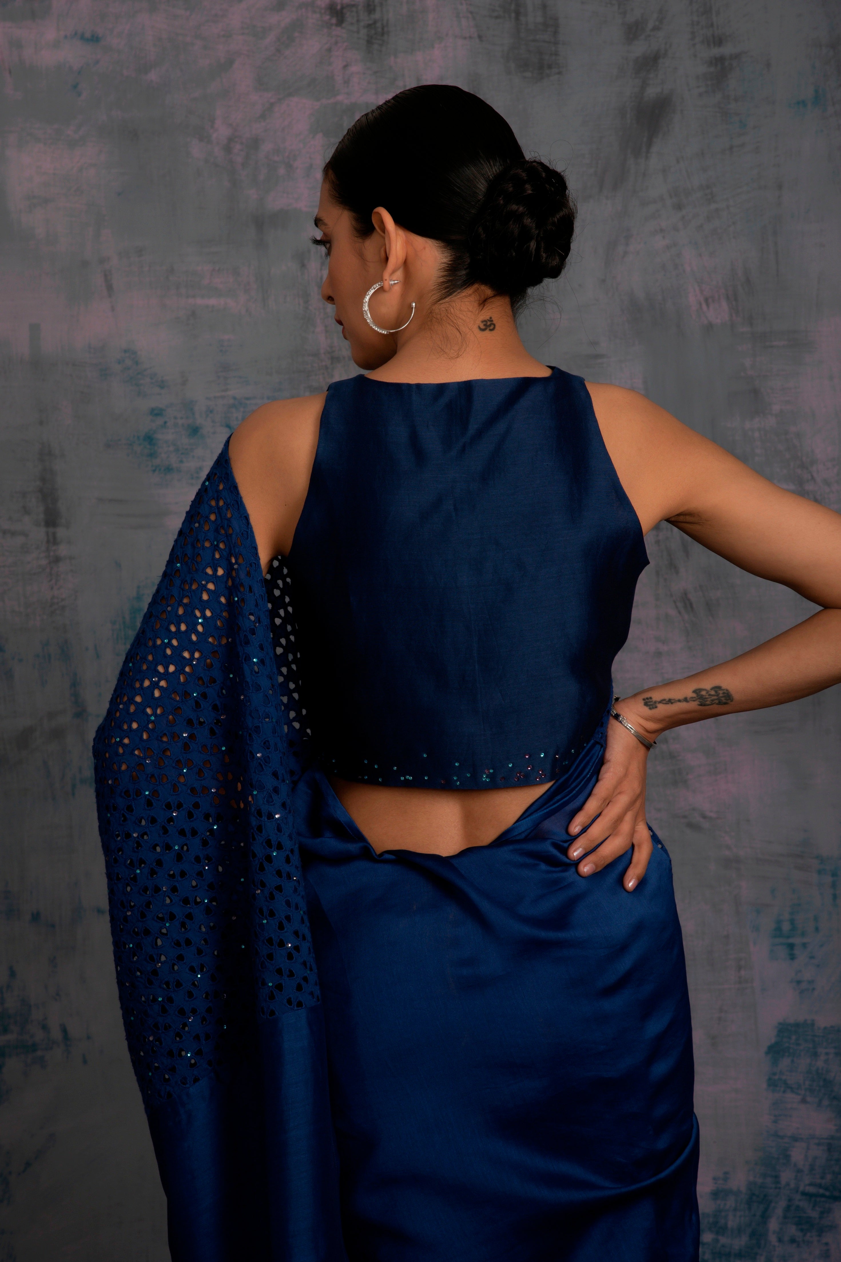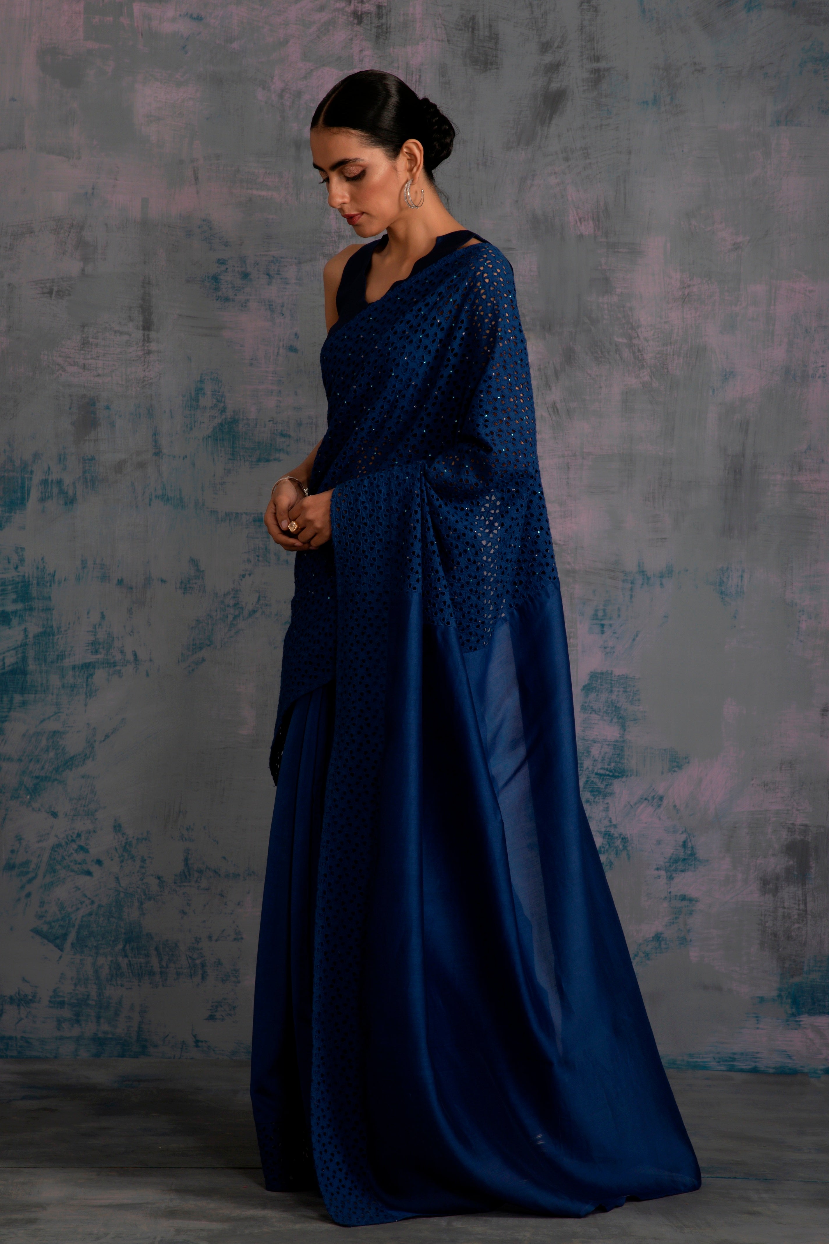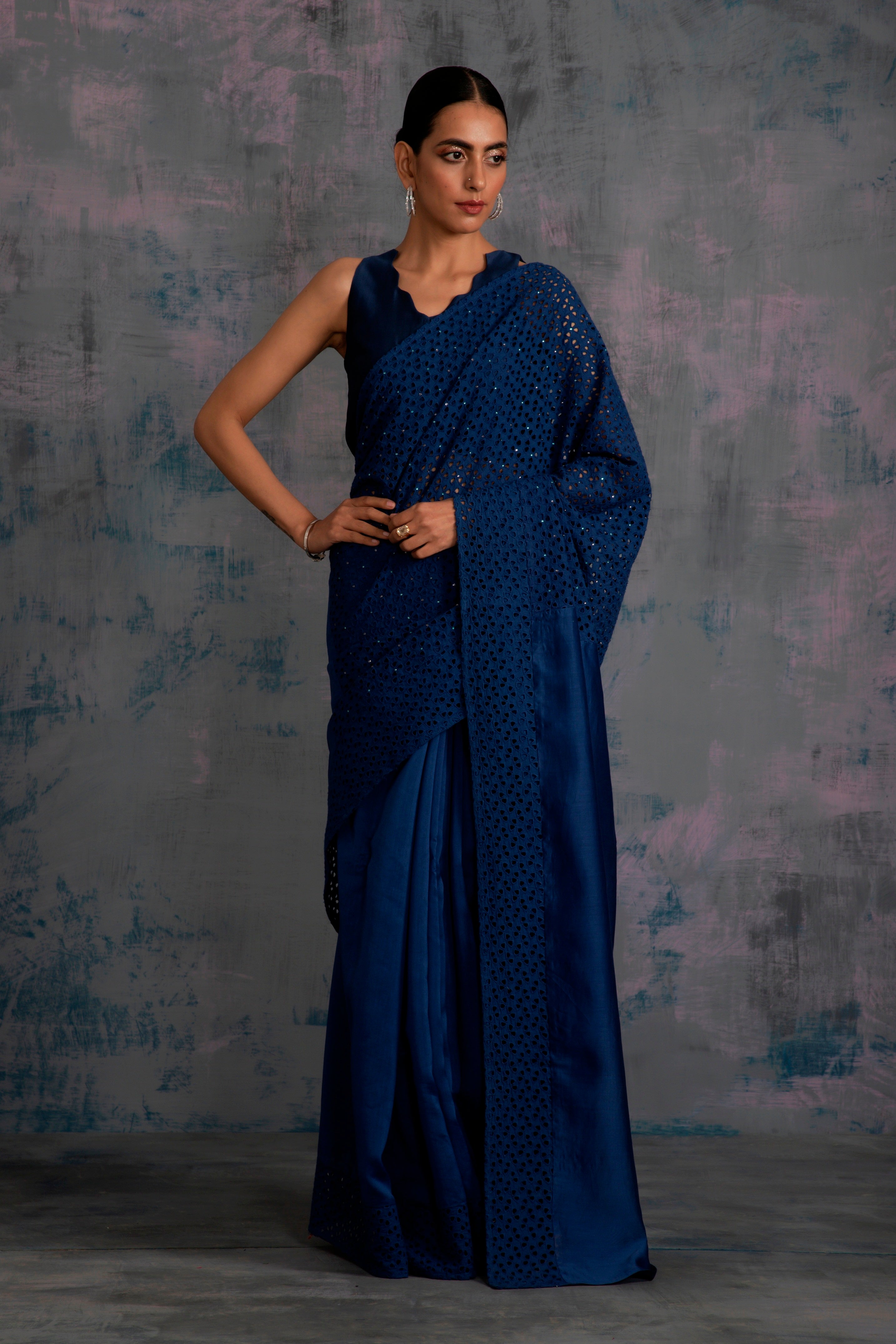 Chanderi saree with cutwork border and pallu. Cutwork pallu is embellished with swarovski, comes with an option of sleeveless jagged neckline crop top blouse embellished with mirror work.