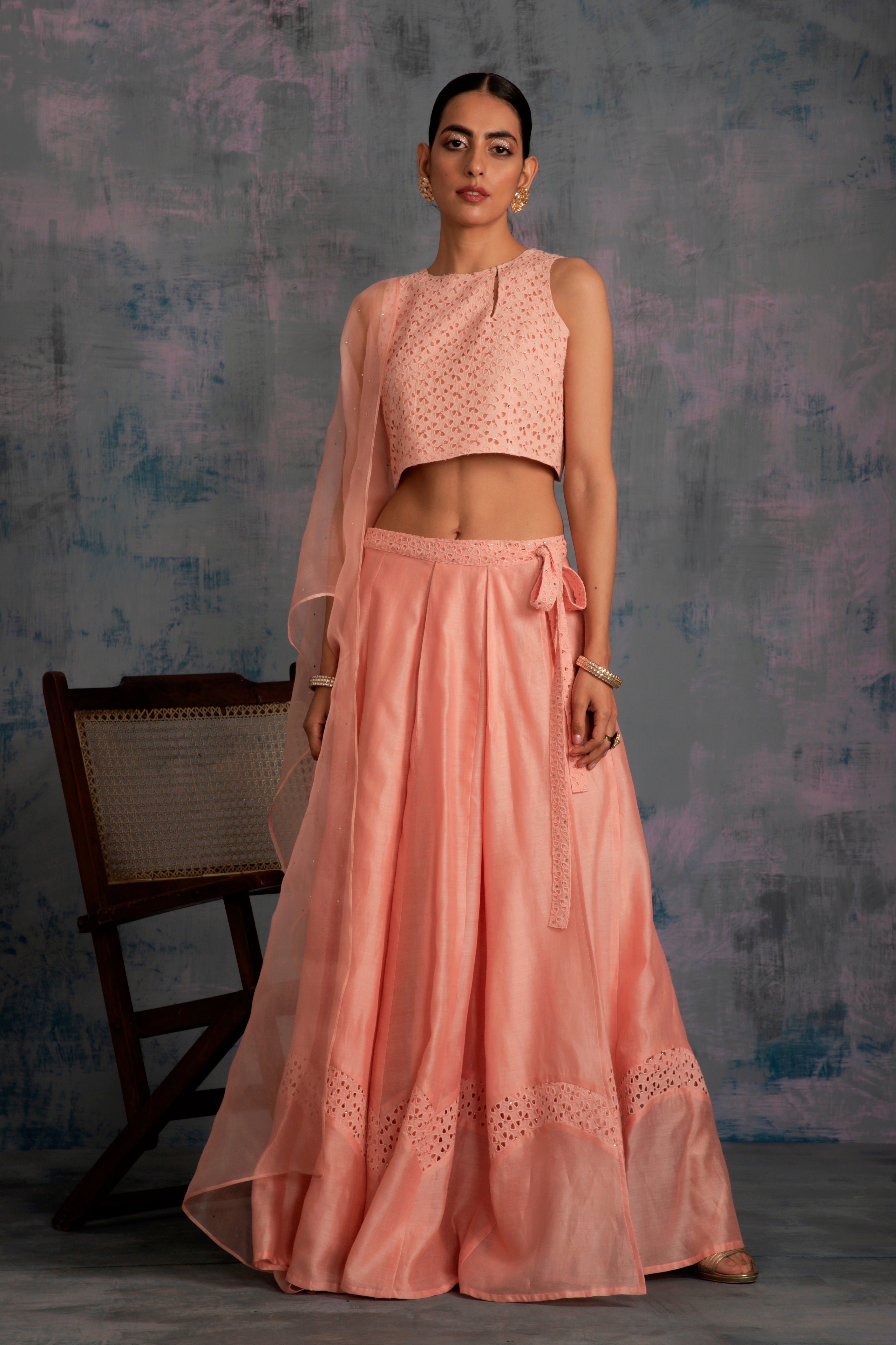 Swarovski Peach Chanderi Lehenga - Set of 3