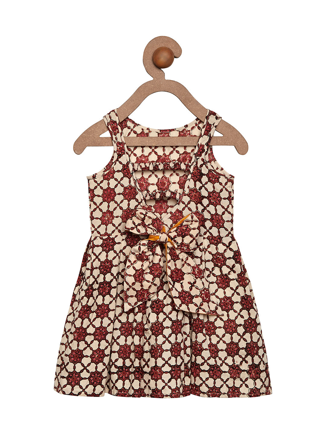 This elegant fit and flare dress with unique floral motifs all over is a must have for your little princess. Stylish V neck back with a contrasting bow adds to the styling.