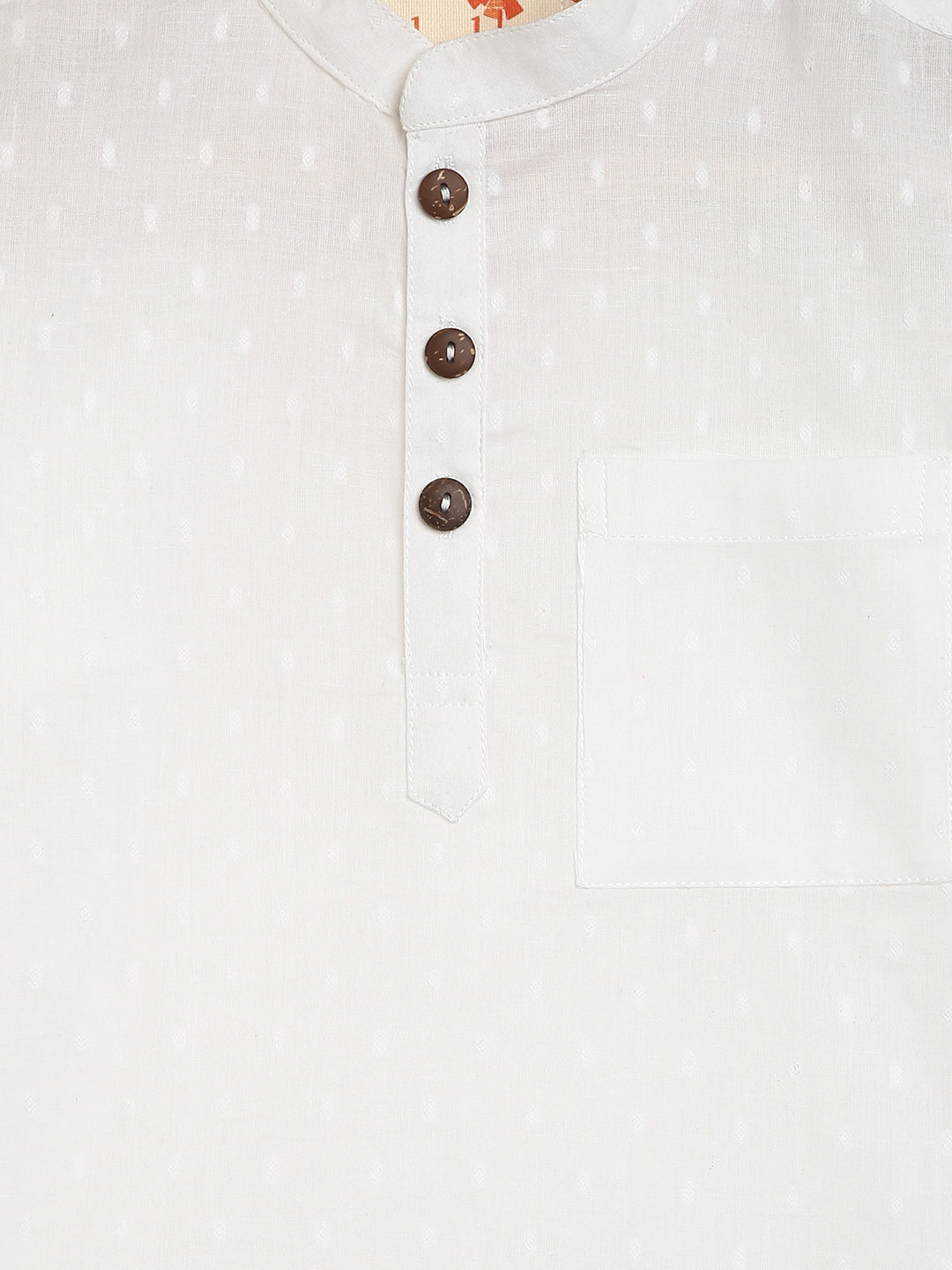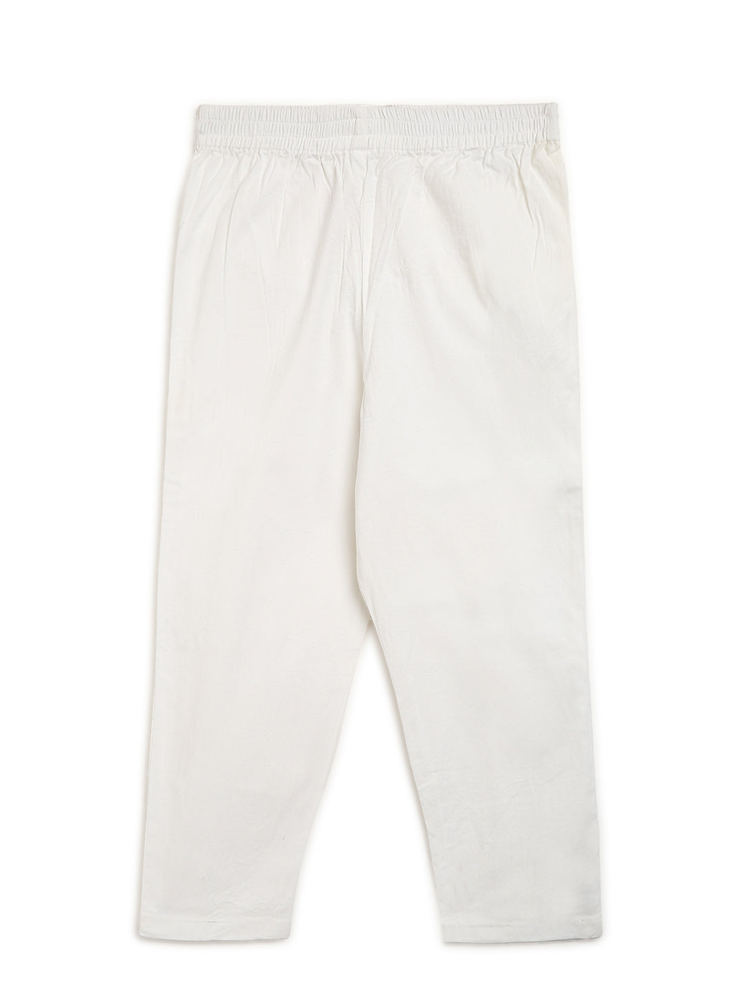 Kurta paired with white elasticated stretch pyjamas for comfort fit. The combination makes for a smart festive look.